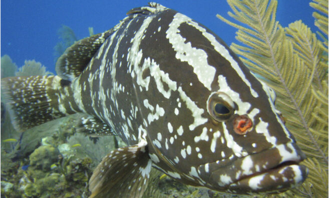 Nassau Groupers are large fish with a pale tan or gray body, identified by four to five irregular dark stripes, black dots around their eyes, and a large black saddle patch on their tail. They grow up to three feet in length and weigh around 55 pounds as adults. They live in warm waters, including the tropical and subtropical waters in the Caribbean and western North Atlantic. Their habitat is associated with hard structures like reefs (both natural and artificial), rocks, and ledges.