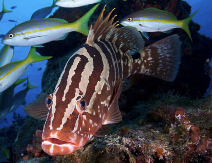 Nassau Groupers are large fish with a pale tan or gray body, identified by four to five irregular dark stripes, black dots around their eyes, and a large black saddle patch on their tail. They grow up to three feet in length and weigh around 55 pounds as adults. They live in warm waters, including the tropical and subtropical waters in the Caribbean and western North Atlantic. Their habitat is associated with hard structures like reefs (both natural and artificial), rocks, and ledges.