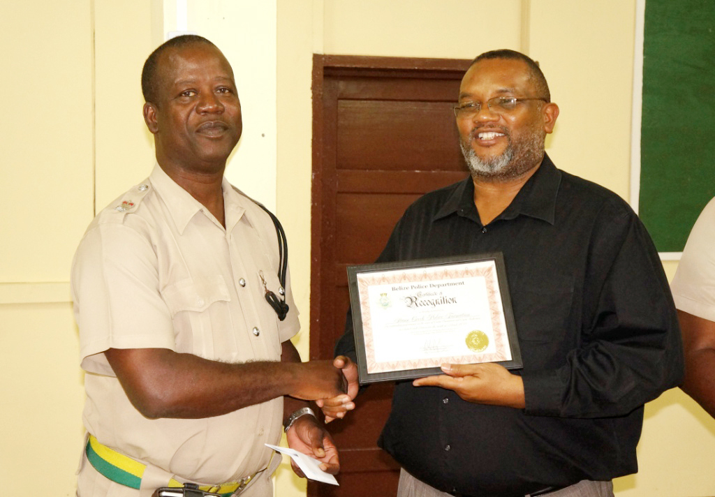On April 17, 2013, Minister of National Security, Hon. John Saldivar presented a Certificate of Award and a cheque of $1,000 to Senior Superintendent Robert Mariano who heads the Southern Zone and is also the Officer Commanding the Dangriga Formation which forms part of the Southern Zone.