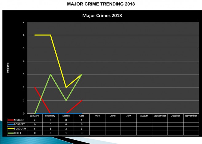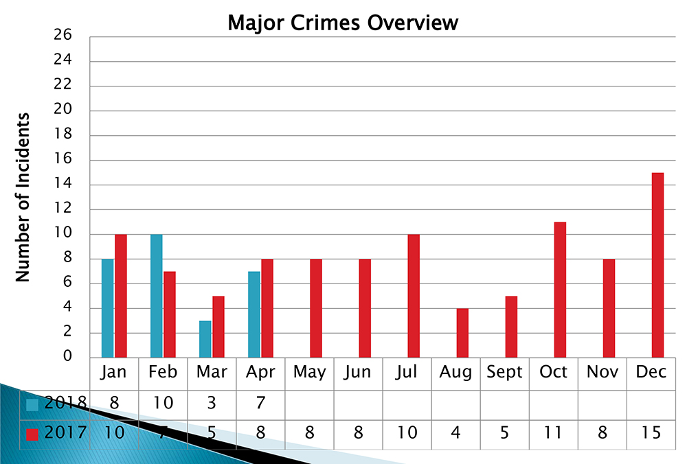 During 2018, the cumulative statistics for January to April indicate that there were seven less major crimes committed than in 2017, which is equivalent to a 13% decrease.