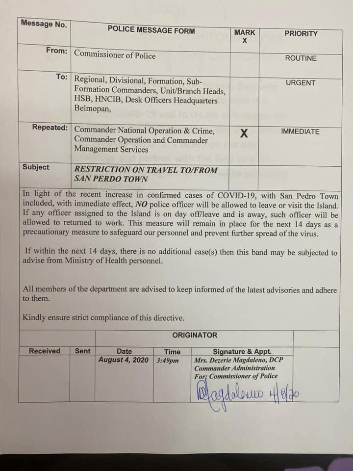 The memo explains that if officers assigned to the island are on day off or leave, they will be allowed to return to work. This restriction in movement to and from Ambergris Caye is with immediate effect and will remain in place for the next 14 days. Afterward, and if there are no further cases of COVID-19, the BPD will look at lifting the ban after consulting with the Ministry of Health.