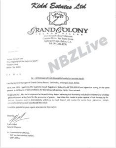 of her Supreme Court bail. Apparently, the management of Grand Colony were the ones who posted the $30,000 plus surety bail, and in a letter submitted to Justice Herbet Lord dated June 25th, stated, “On 20 June 2021, Ms. Hartin appeared at Grand Colony Resort behaving in a disorderly and abusive manner and creating a great disturbance at the hotel in the presence of guests. I now think Ms. Hartin is quite capable of not showing up to trial, and I, therefore, wish to immediately withdraw my cash deposit and revoke the surety I signed as I simply cannot afford the financial loss should this occur,” the letter was signed by Frank Habet, General Manager for Grand Colony.