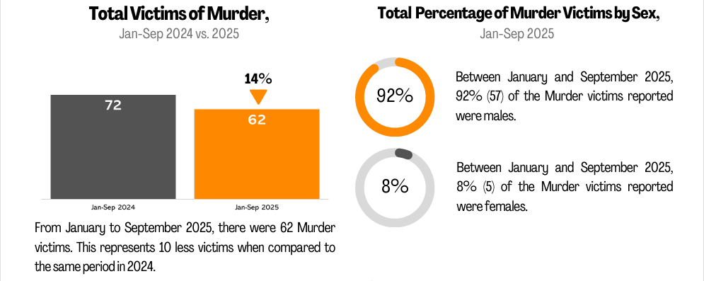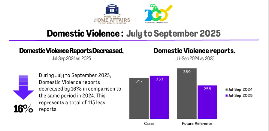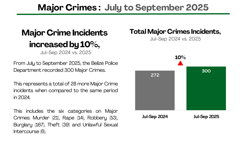 From July to September 2025, Belize recorded an increase in major crimes and murders, while domestic violence reports showed a notable decline. The Belize Crime Observatory’s latest third-quarter report revealed that the Belize Police Department documented a total of 300 major crimes during this period, 28 more than the same quarter in 2024. These included 21 murders, 14 rapes, 53 robberies, and 167 burglaries. In contrast, domestic violence reports dropped by 16 cases to 333.