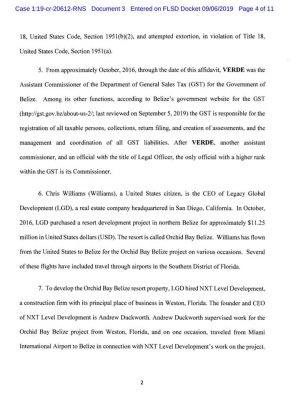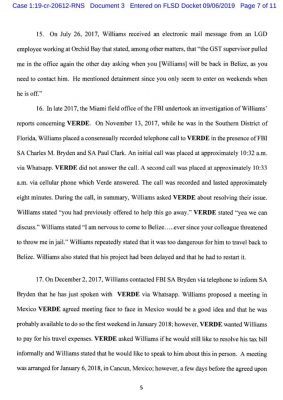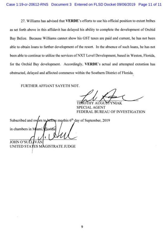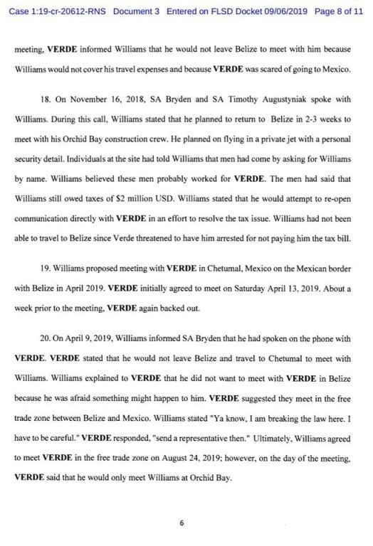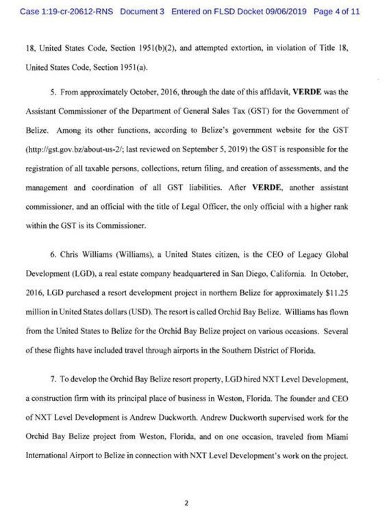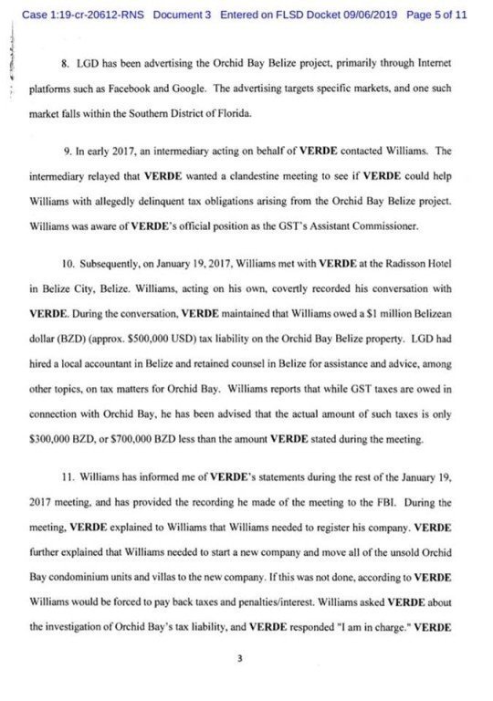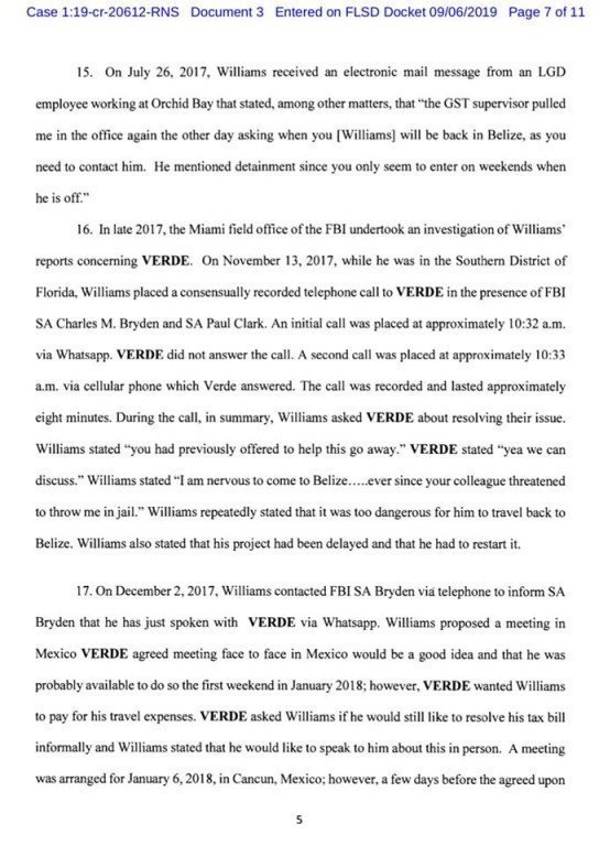 Verde came to the attention of the FBI when a criminal complaint was made by investor Chris Williams, Chief Executive Officer of a real estate company which is behind the project of Orchid Bay Resort in the Corozal District. The allegations, according to an affidavit filed by a special FBI agent, stated that early in 2017, Verde contacted Williams through a third person requesting a meeting to discuss taxes owed by Orchid Bay. At this time, Verde was the Assistant Commissioner for the General Sales Tax Department which is now under the Belize Tax Services umbrella. According to the affidavit, Verde and Williams reportedly met on January 19, 2017, in Belize City. Unknown to Verde, Williams recorded what was discussed in the gathering.