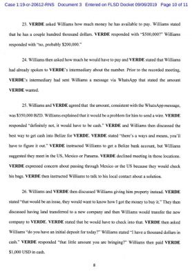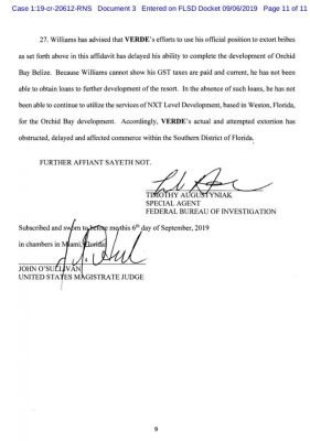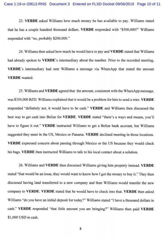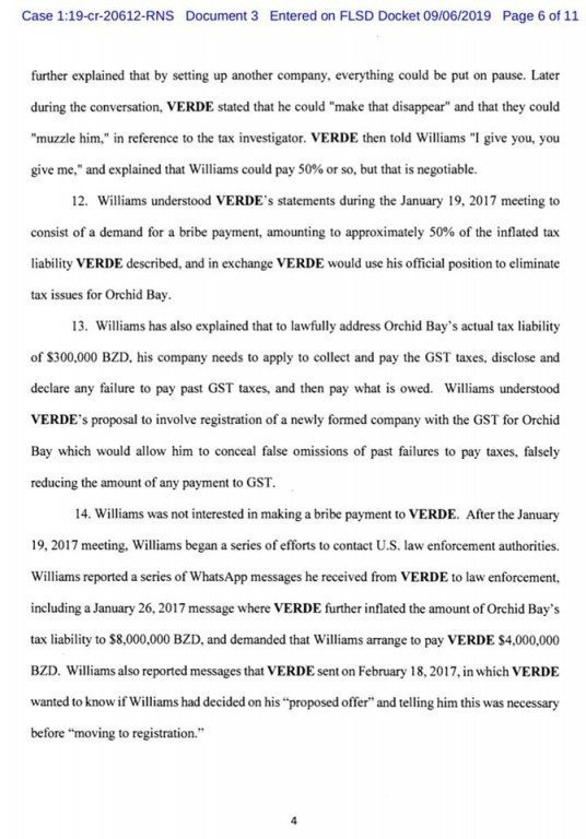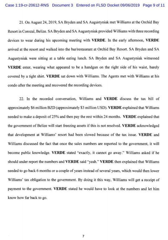 Williams did not accept the offer and reportedly return to the USA where he notified agents of the FBI. According to him, Verde became persistent, and Williams recorded messages in which Verde claimed Orchid Bay’s tax liabilities had gone up to BZ$6 million, and that he would need to make a 25% deposit and then pay the rest within 24 months. To help Williams with the back taxes, Verde was attempting to collect $BZ350, 000 in bribes.