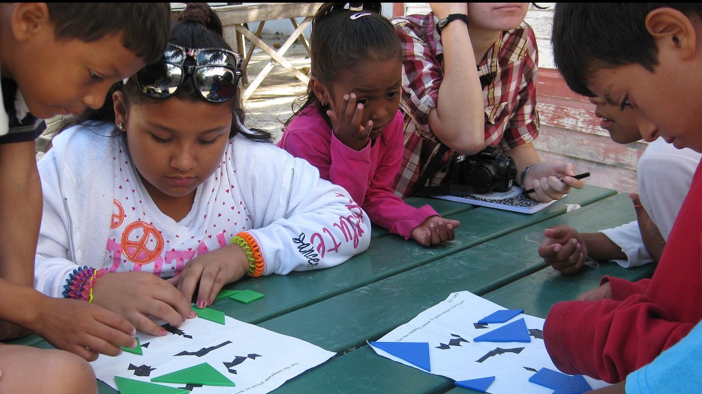 Belizean students complete geometry activities during an academic enrichment exercise at the Lion’€™s Club building in San Pedro. Photo by Ole Miss