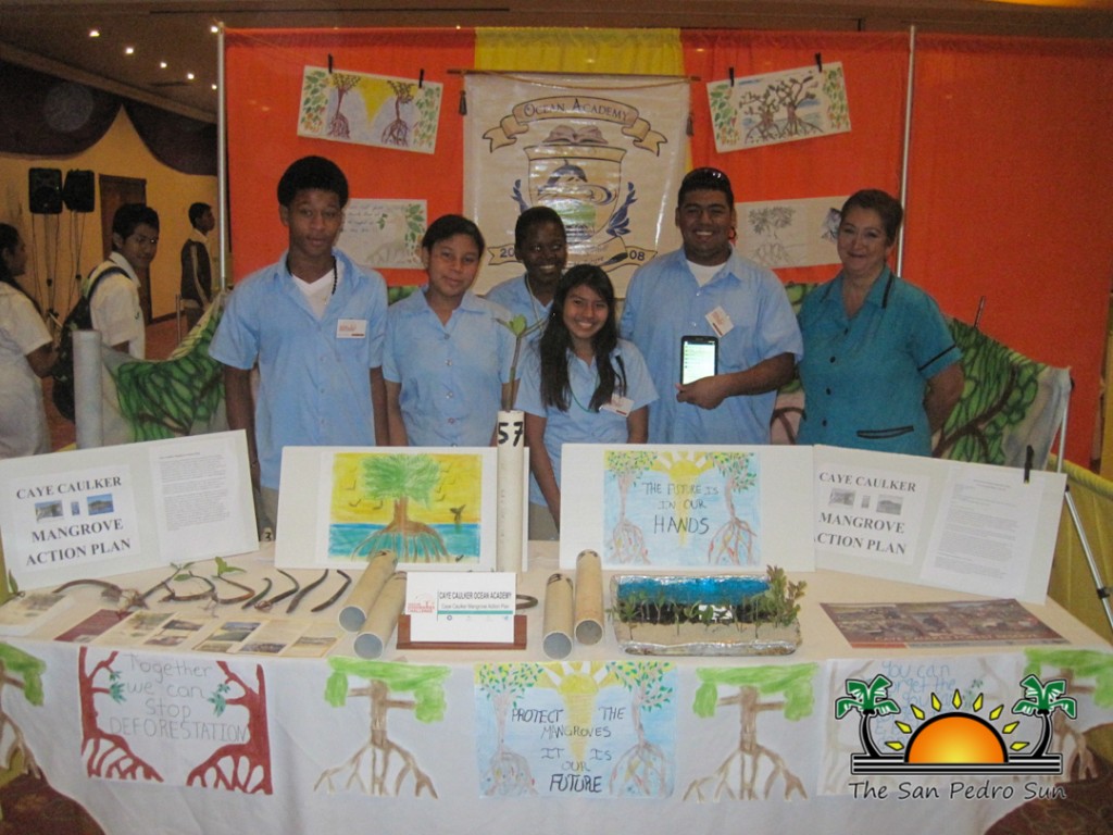 Ocean’s Academy’s team’s project was titled “Caye Caulker Mangrove Action Plan” and it addressed the problem of intense deforestation of mangroves due to coastal development, through education, reforestation and interactive involvement using mobile app technology. “The first part of the plan involved educating the public about the importance of mangroves to the environment and the local economy. We then will work with the Village Council to understand the laws concerning mangroves and encourage a reforestation program whenever mangroves are removed. We would then experiment with different planting methods, such as the Riley technique, to determine the most effective techniques for our location. Finally, we would create an interactive smart phone app that will allow people to learn about mangroves, see pictures of our mangrove planting experiments and visit the sites on a trail walk using GPS coordinates. Visitors are invited to upload phOcean Academy Sagicor Winners-1otographs of the growing plants to aid with our data collection and analysis. Ocean Academy Environmental Club’s ultimate goal is to increase awareness of the importance of mangrove ecosystems and reduce mangrove deforestation,” said Joni Miller on the group’s project. Caye Caulker’s team included team leader Buddy Magana, and members Patrick, Adreanne, Daya, Kenisha and science teacher Sarah Requena. For the project’s uniqueness, the judges awarded it the “Most Creative and Innovative Project” award.