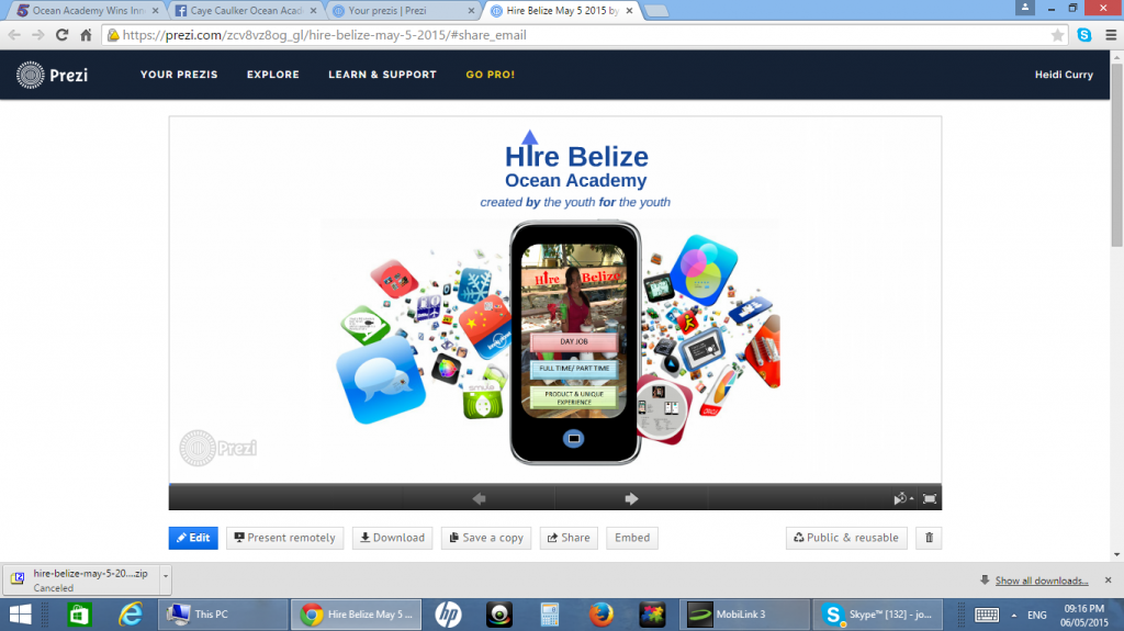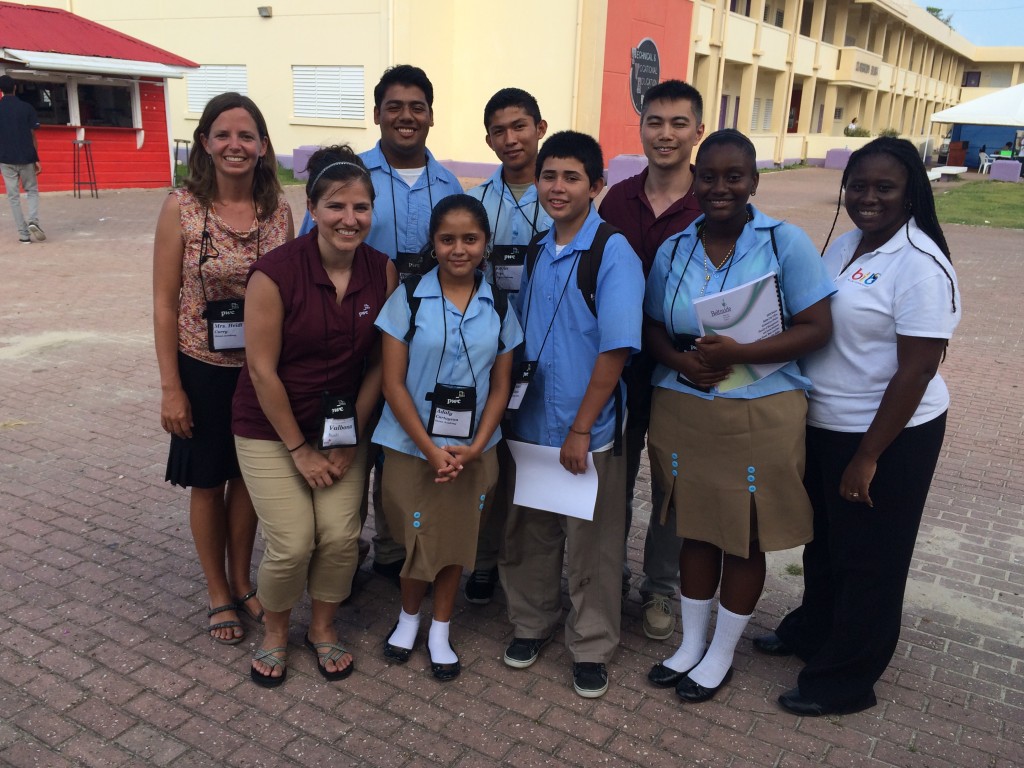 First Place, PwC Innovation Challenge, for Hire Belize Mobile App Solution to Youth Unemployment. Heidi Curry, Valbona Bushi, Buddy Magana, Adaly Cartagena, Kevin Tzac, Ismael Florian, Sam Liu, Ashtasia Ovado, Shola Babb. May 2015.