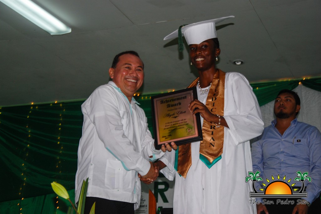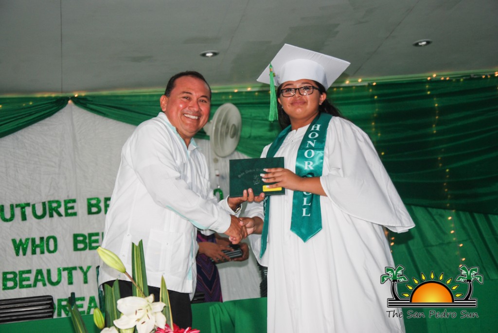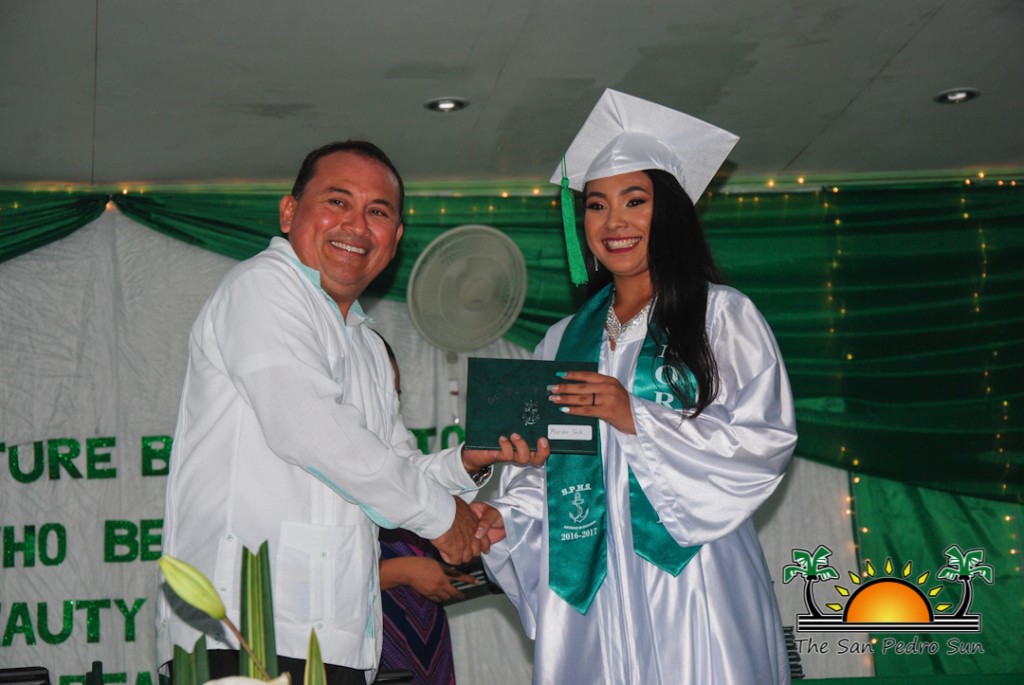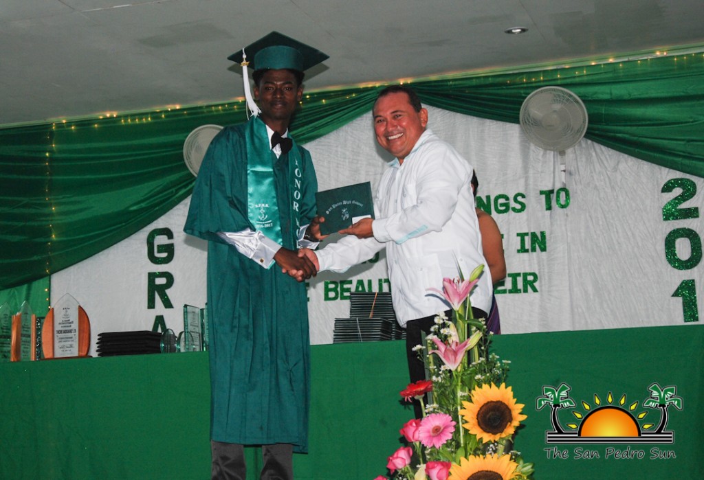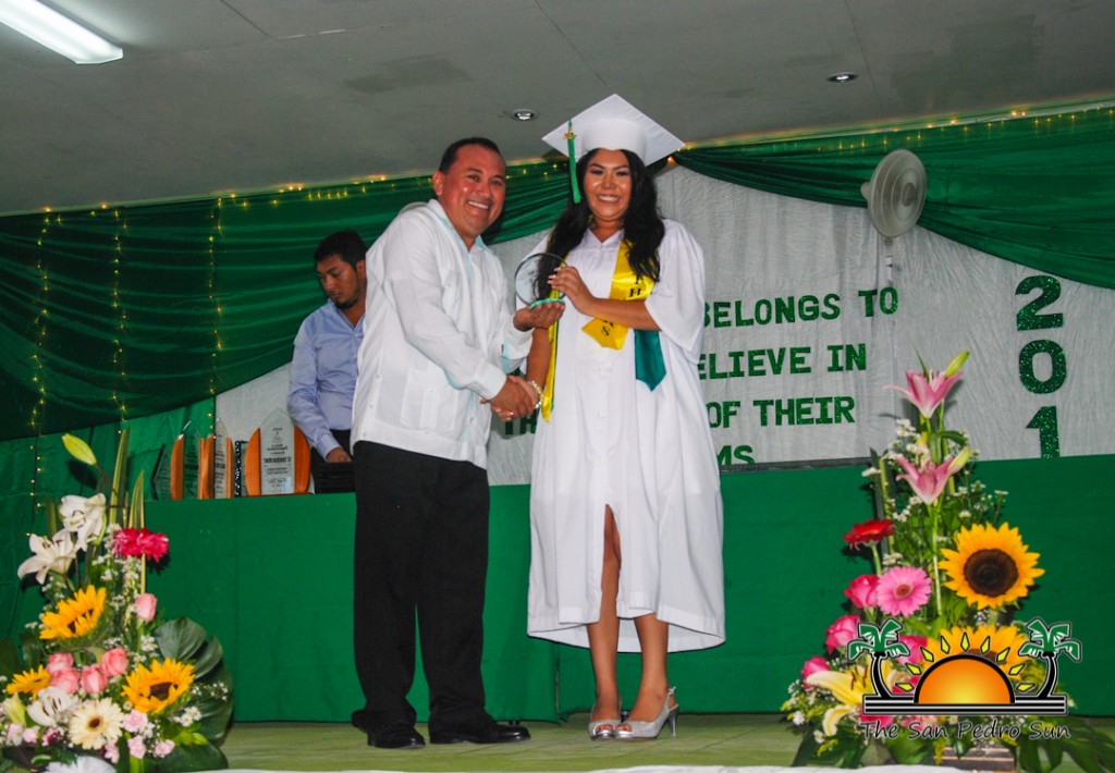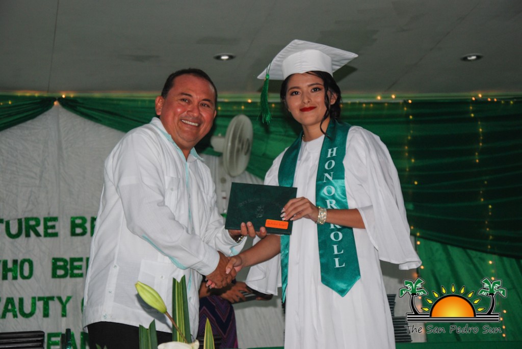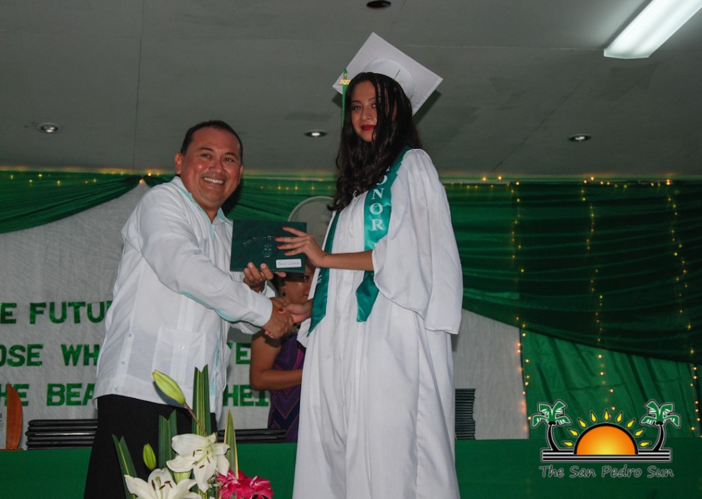 Principal Emil Vasquez and Chairman Abner Andre Perez distributed diplomas to the Class of 2017, after which outstanding students were awarded. Male Athlete of the Year went to Guillermo Nuñez, while Female Athlete of the Year went to Ada Cordova. Senior of the Year went to Kristy Novelo, and Vladimir Campos won the Perseverance Award.
