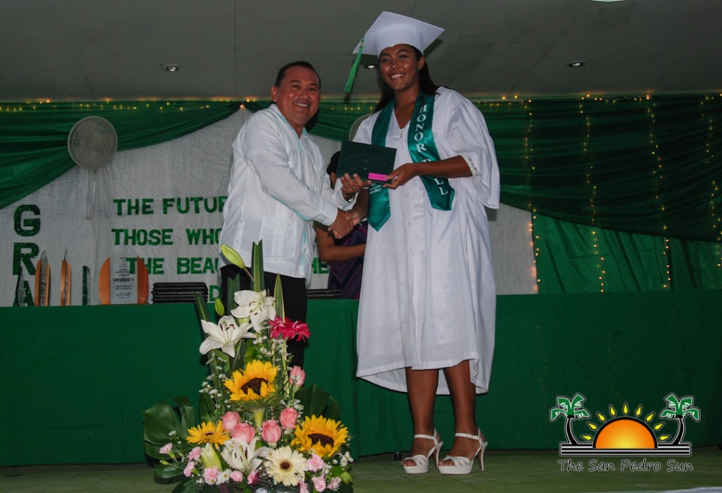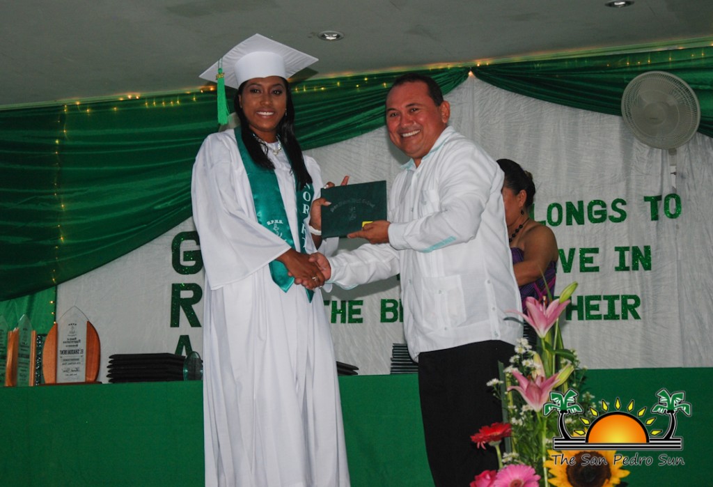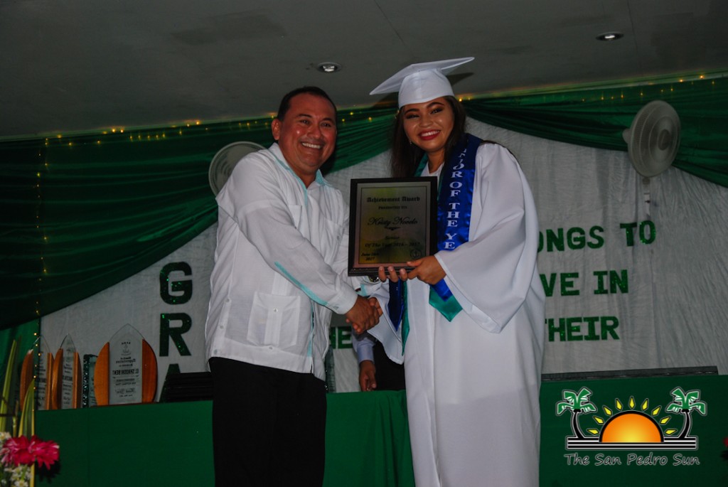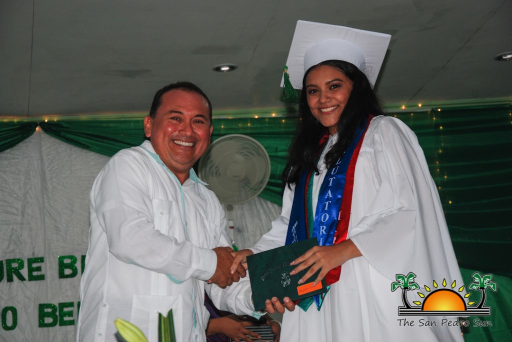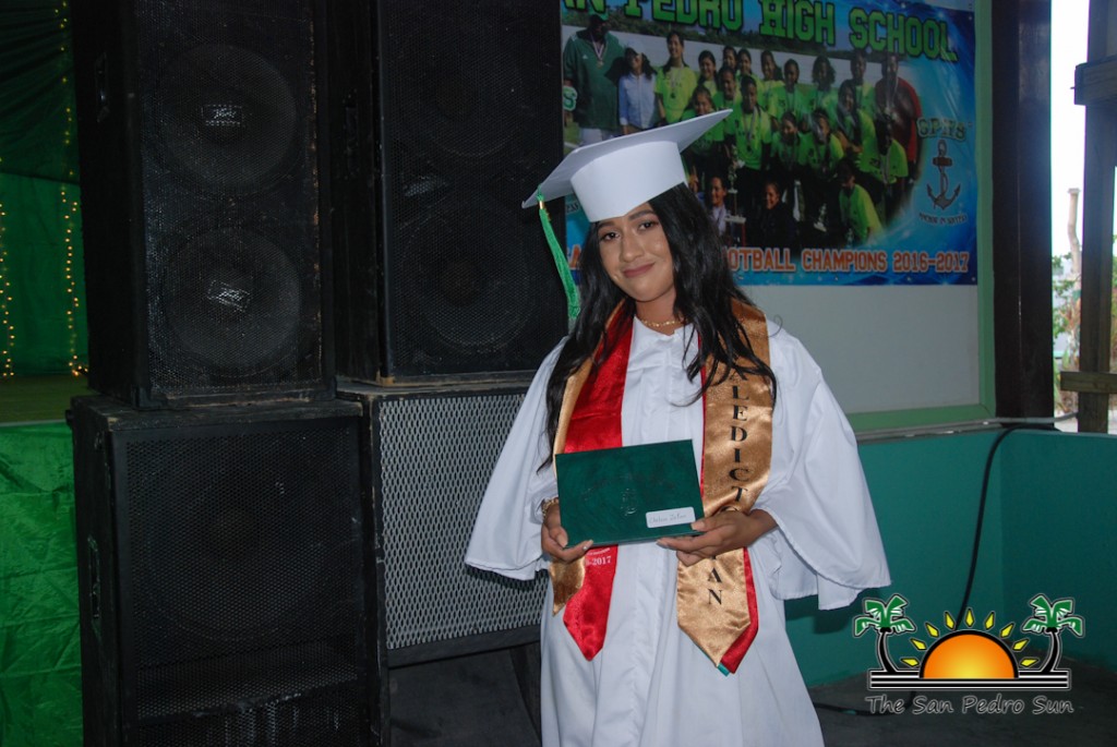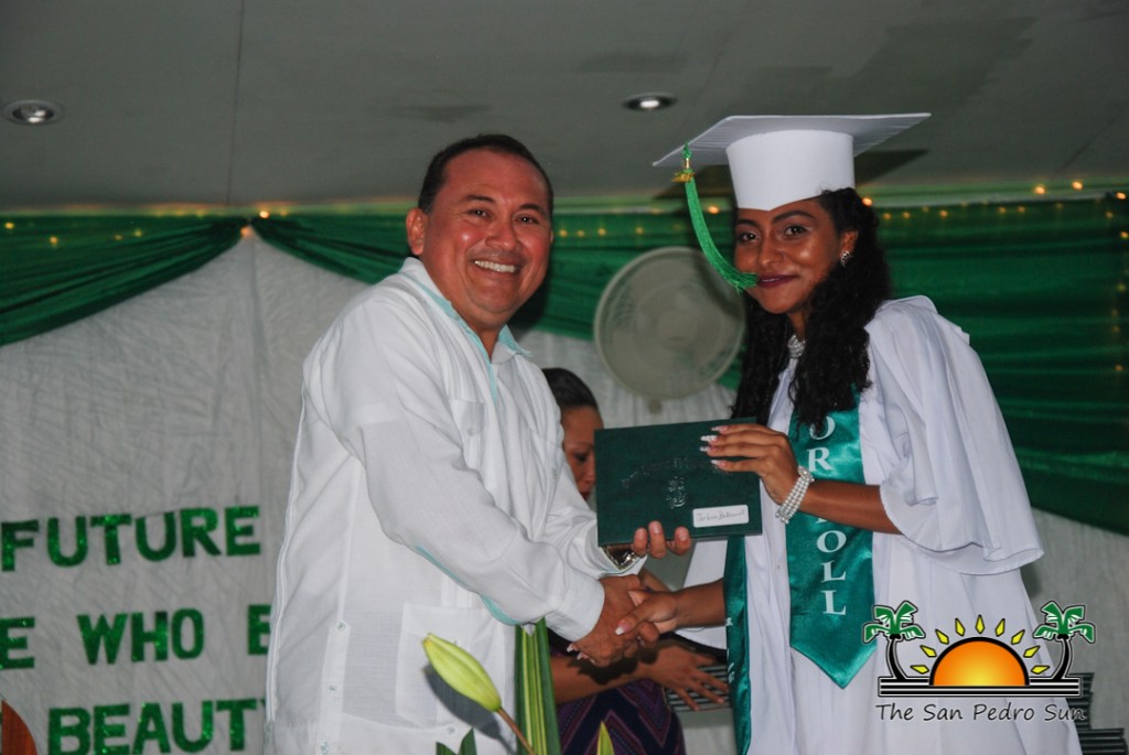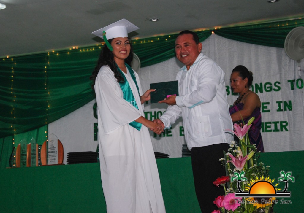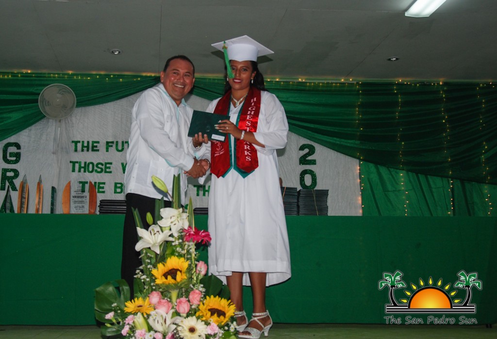 Principal Emil Vasquez and Chairman Abner Andre Perez distributed diplomas to the Class of 2017, after which outstanding students were awarded. Male Athlete of the Year went to Guillermo Nuñez, while Female Athlete of the Year went to Ada Cordova. Senior of the Year went to Kristy Novelo, and Vladimir Campos won the Perseverance Award.