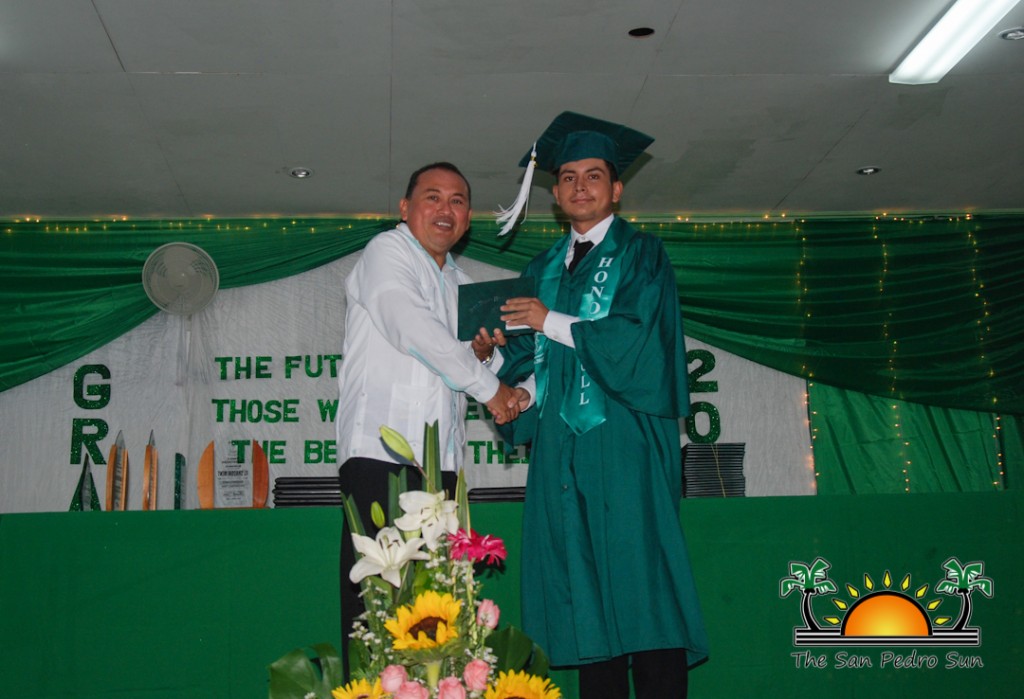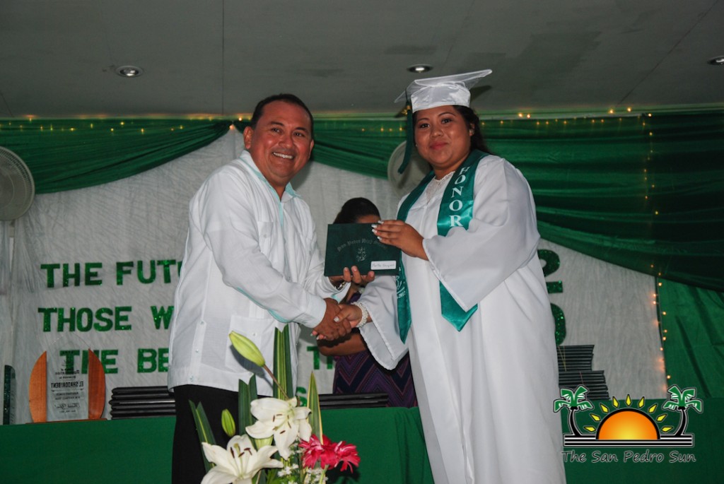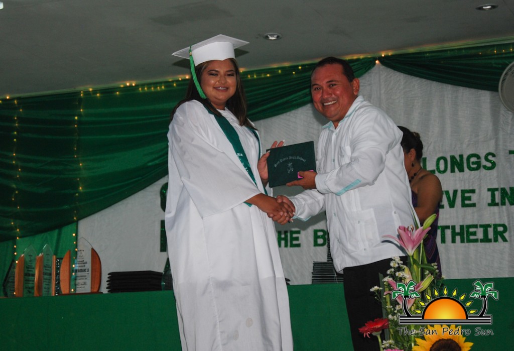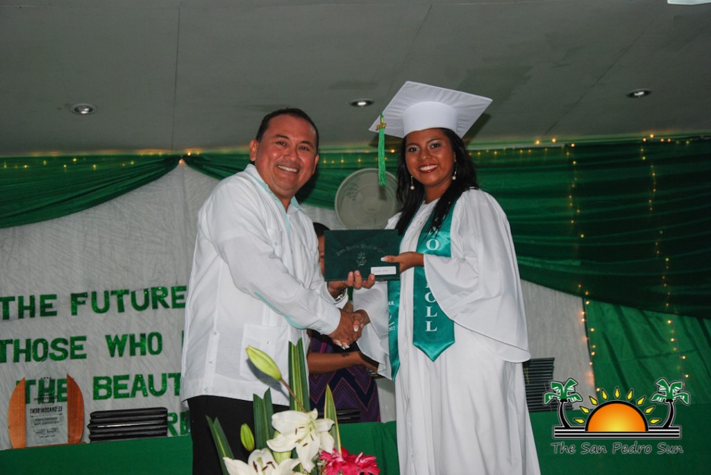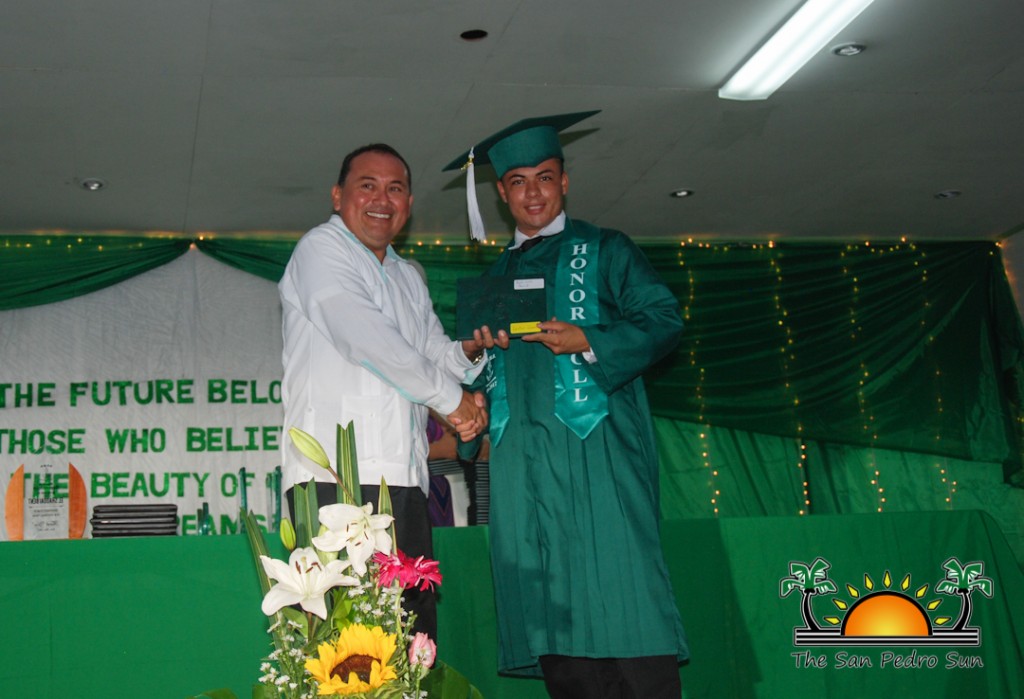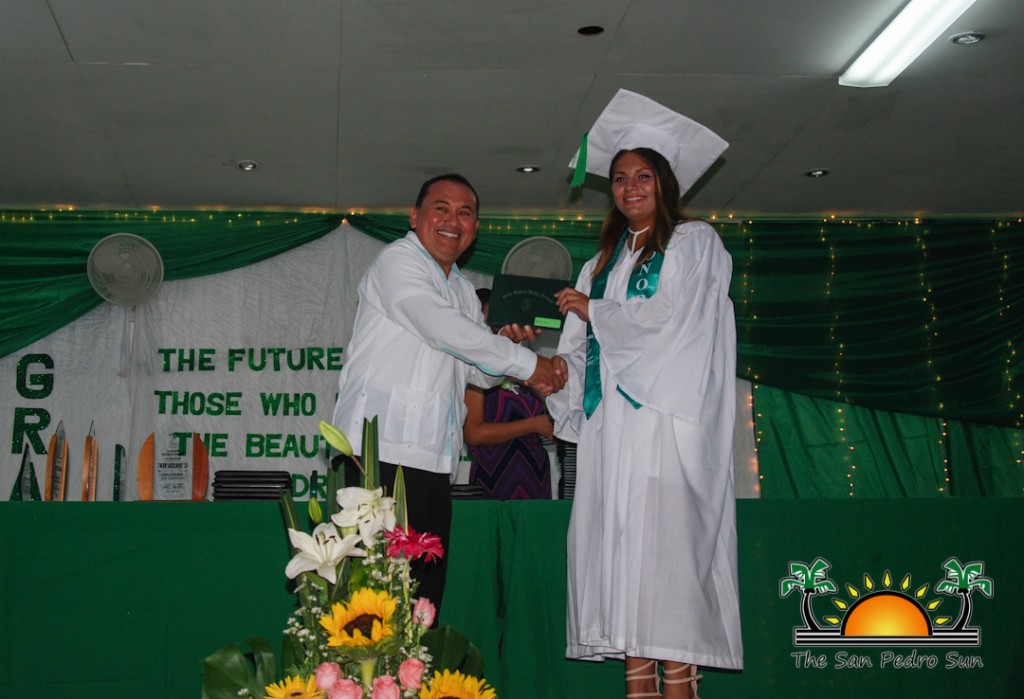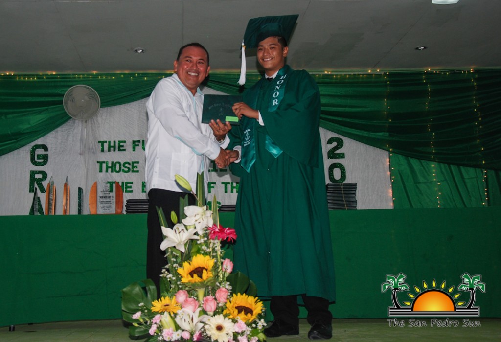 Principal Emil Vasquez and Chairman Abner Andre Perez distributed diplomas to the Class of 2017, after which outstanding students were awarded. Male Athlete of the Year went to Guillermo Nuñez, while Female Athlete of the Year went to Ada Cordova. Senior of the Year went to Kristy Novelo, and Vladimir Campos won the Perseverance Award.