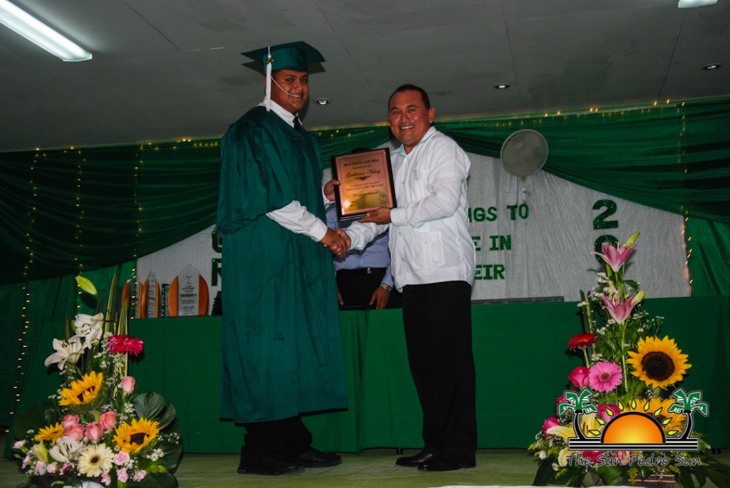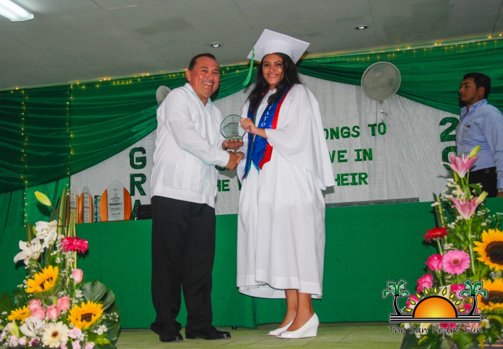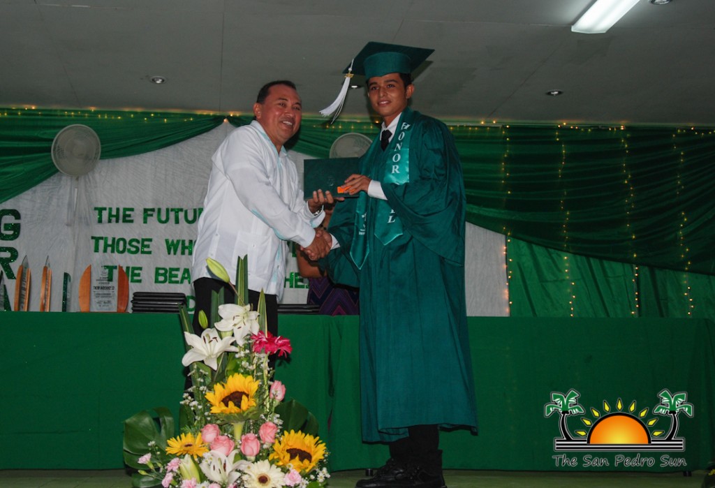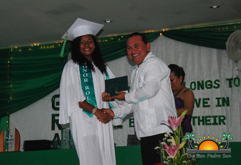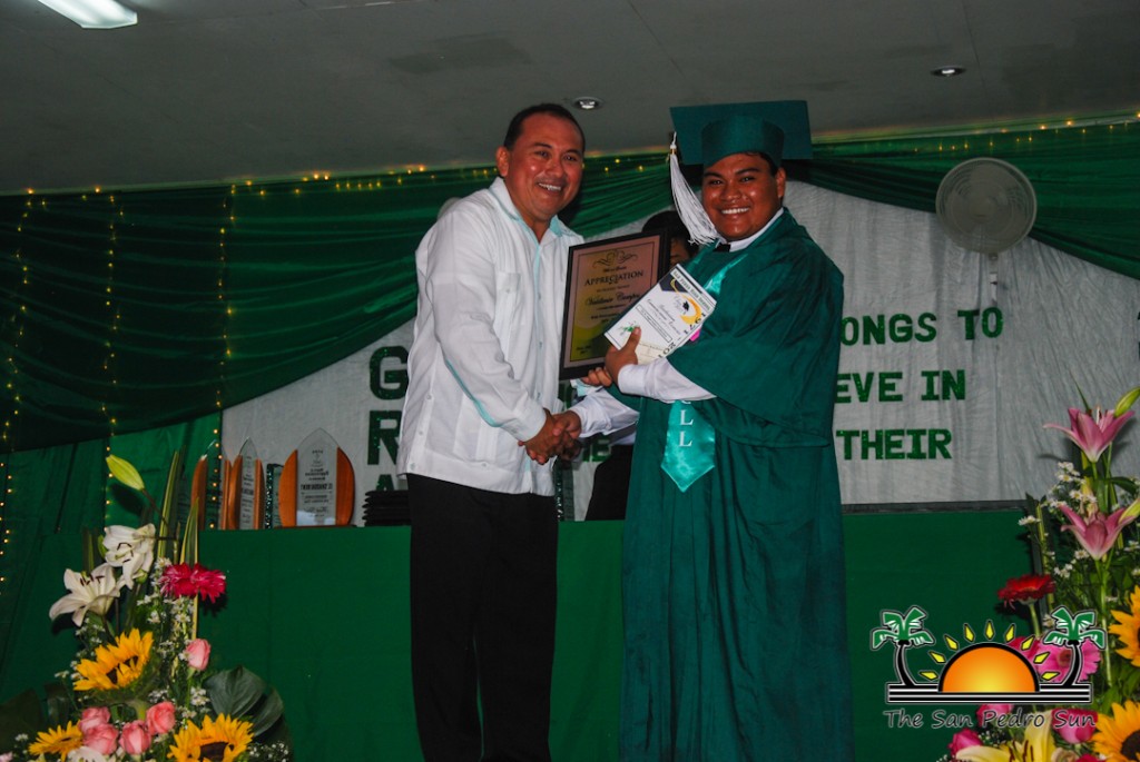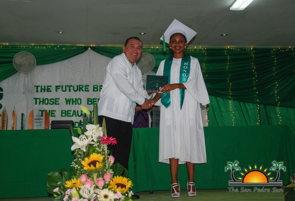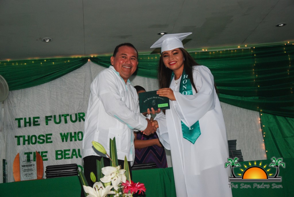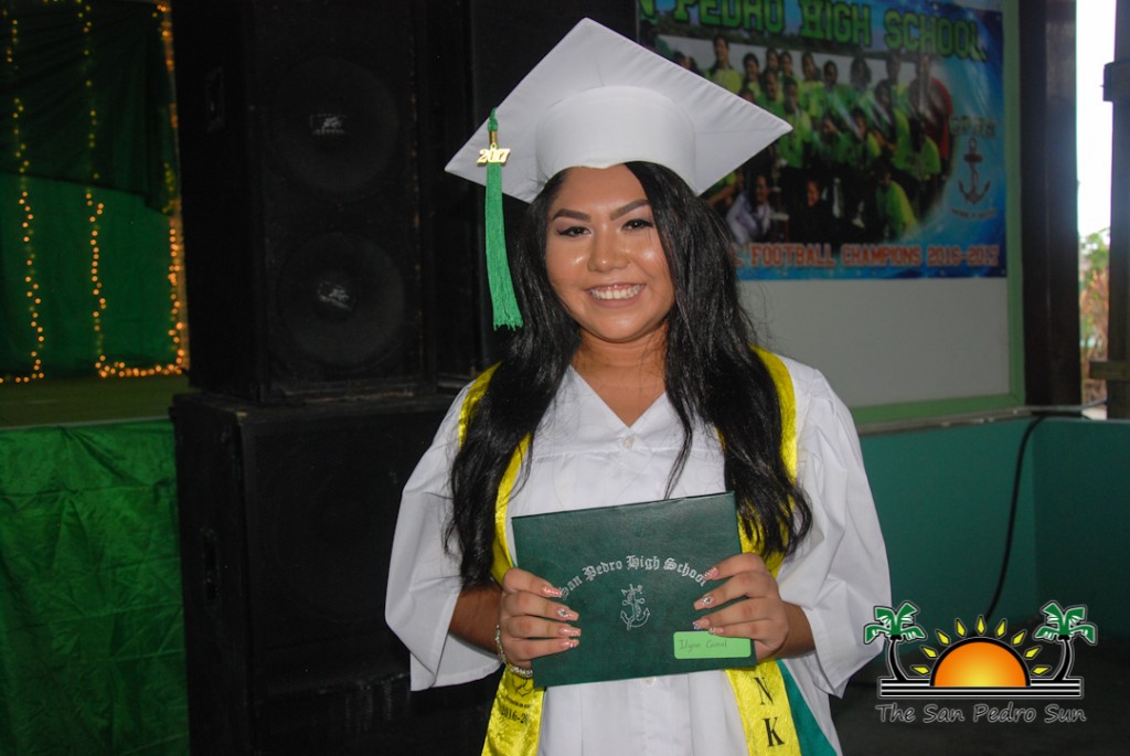 Principal Emil Vasquez and Chairman Abner Andre Perez distributed diplomas to the Class of 2017, after which outstanding students were awarded. Male Athlete of the Year went to Guillermo Nuñez, while Female Athlete of the Year went to Ada Cordova. Senior of the Year went to Kristy Novelo, and Vladimir Campos won the Perseverance Award.
