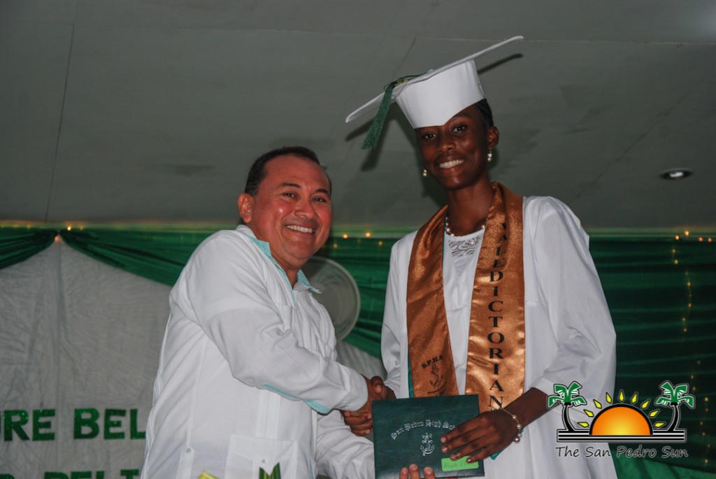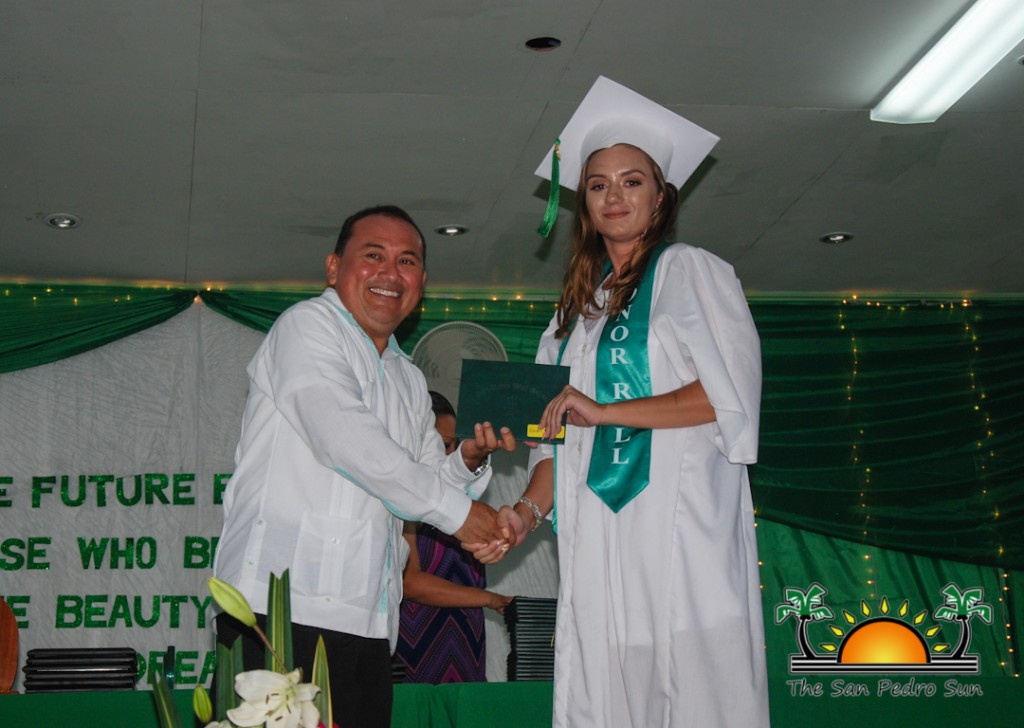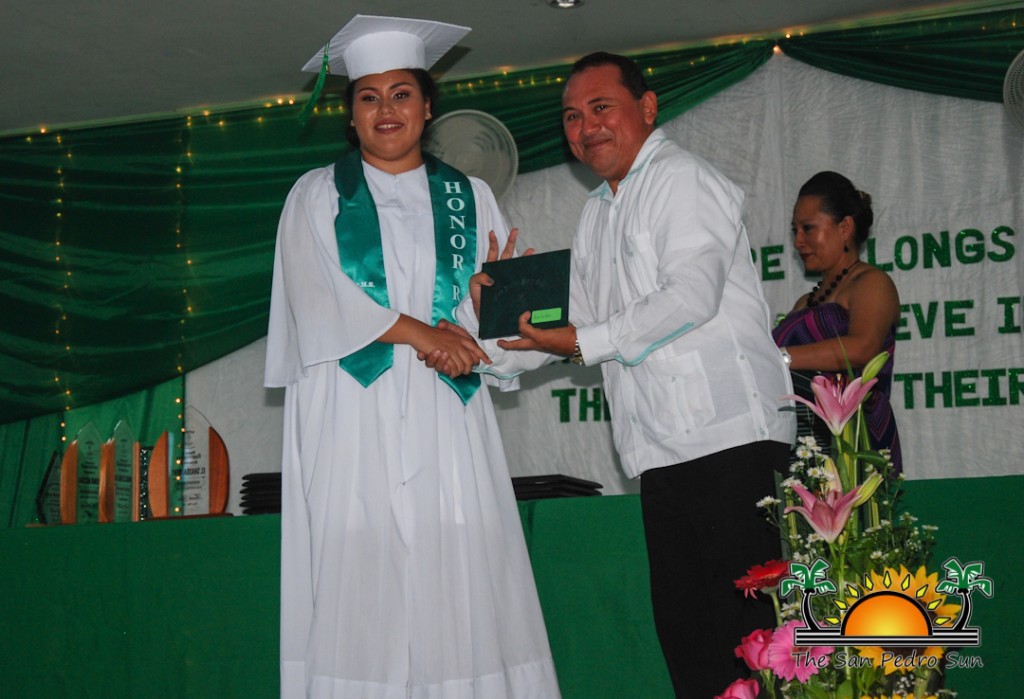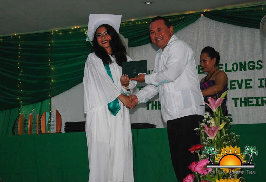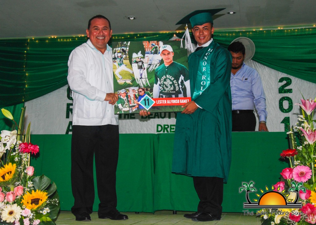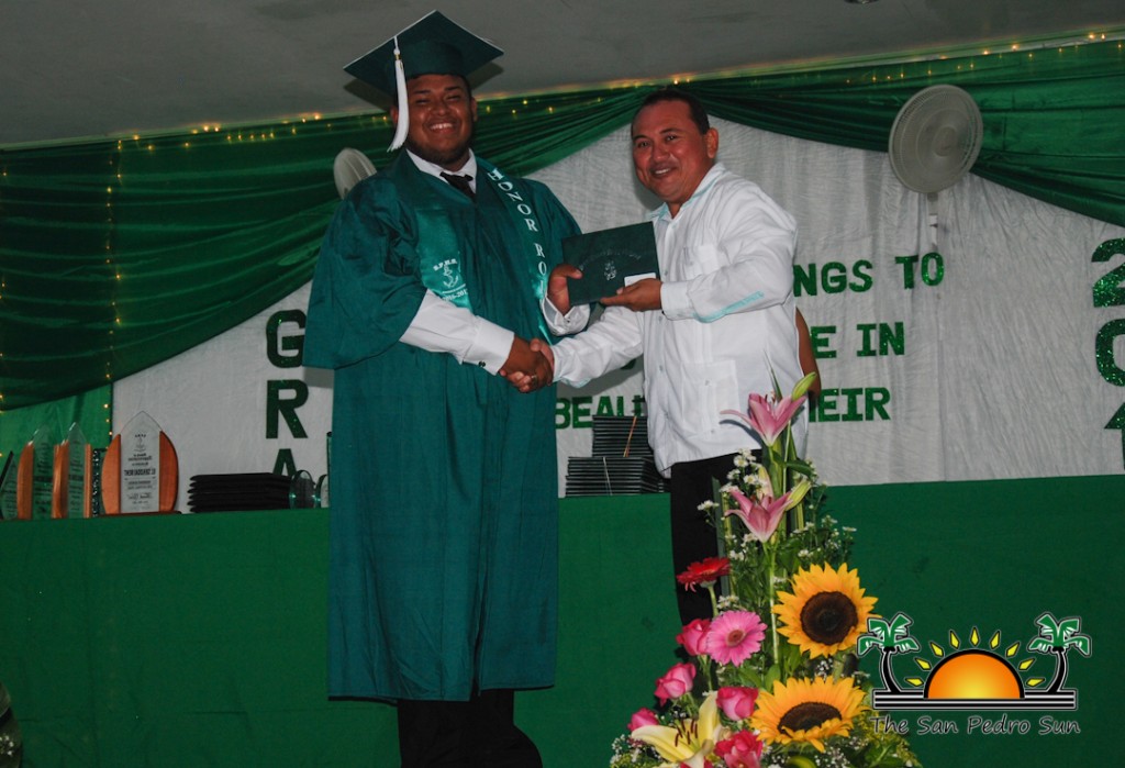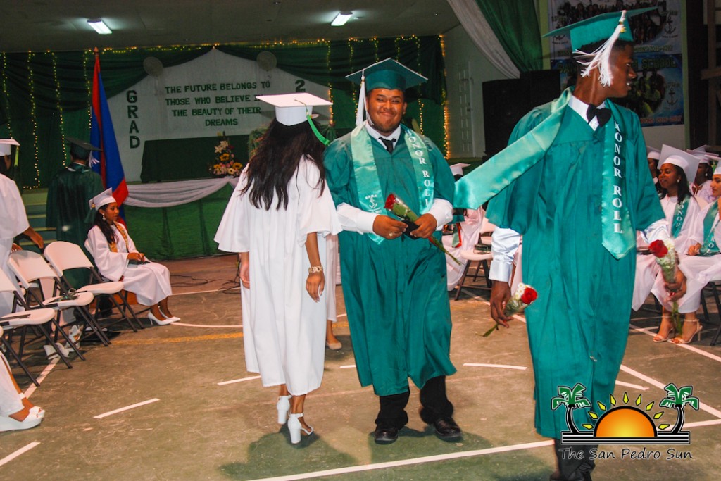 Principal Emil Vasquez and Chairman Abner Andre Perez distributed diplomas to the Class of 2017, after which outstanding students were awarded. Male Athlete of the Year went to Guillermo Nuñez, while Female Athlete of the Year went to Ada Cordova. Senior of the Year went to Kristy Novelo, and Vladimir Campos won the Perseverance Award.
