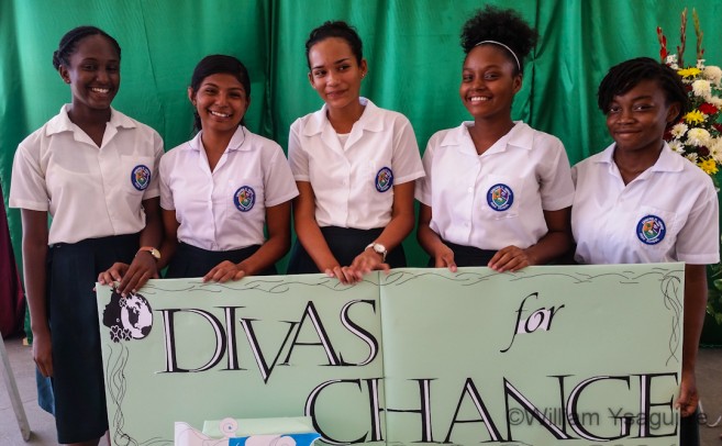 Edward P. Yorke High School’s “Divas for Change”: Rosa Hernandez, Rosalinda Gonzalez, Leilani Morales, Danielle Mohamed-Ali and Antonisha Gibson won second prize, each received a $500 cash prize and a tablet computer each, and a Canon printer for their school.