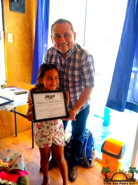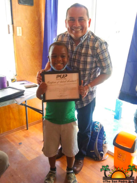 Caye Caulker primary school students receive tuition assistance from Andre Perez, PUP Standard Bearer