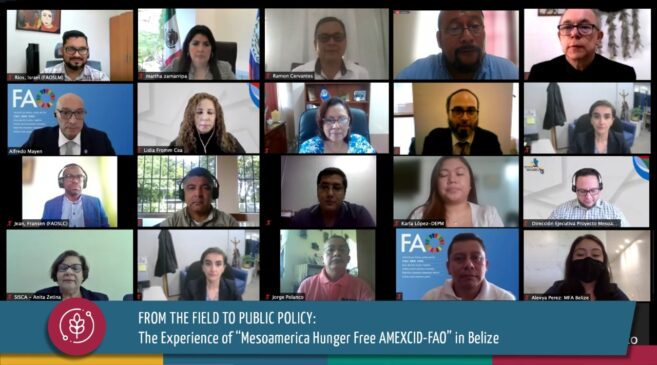 As part of the high-level policy dialogue promoted by the “Mesoamerica Hunger Free AMEXCID-FAO” program, a virtual meeting was held jointly with the Executive Directorate of the Mesoamerican Integration and Development Project (MP), as a follow-up to the work plan for the second half of 2021 of the Joint Presidency of the MP, held by Mexico and Honduras. The purpose of the meeting was to share the experiences and results achieved within the framework of “Mesoamerica Hunger Free AMEXCID-FAO” in Belize.