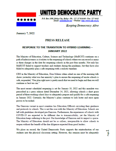 The Opposition (United Democratic Party) said in a press release dated Friday, January 7th, that enough time was not been given for schools to adequately prepare and qualify for a safe re-opening. According to the Opposition, the plans for the re-opening of schools were rushed. They also note that the Omicron variant has education officials in many other countries revisiting their guidance and protocols for schools, but the Ministry of Education’s (MOE) guidelines were developed pre-Omicron. The release ends suggesting an extensive list of conditions MOE should enforce, such as vaccination procurement and rollout for students five to eleven years old, continued vaccination campaign for students twelve years and older, providing all schools, especially government schools, with wash hand basins, thermometers, social distancing markers, and disposable masks. The Opposition also mandated regular cleaning and hygiene kits or a financial grant to purchase such materials for the duration of the pandemic. They added that there should be improvements in classroom ventilation by upgrading antiquated designs. Another of the requests includes regular free testing for all teachers and auxiliary staff.