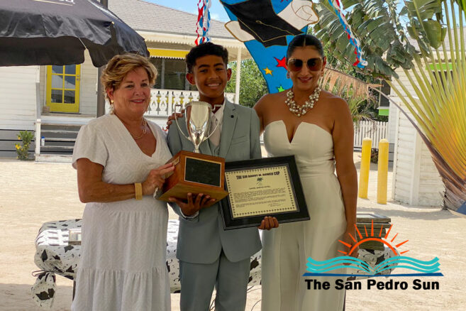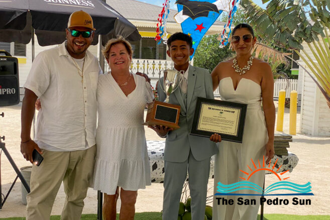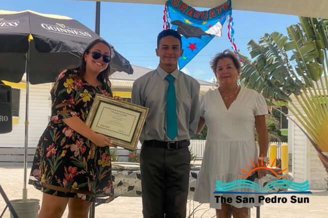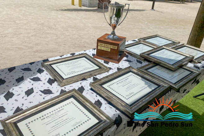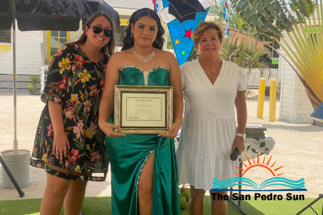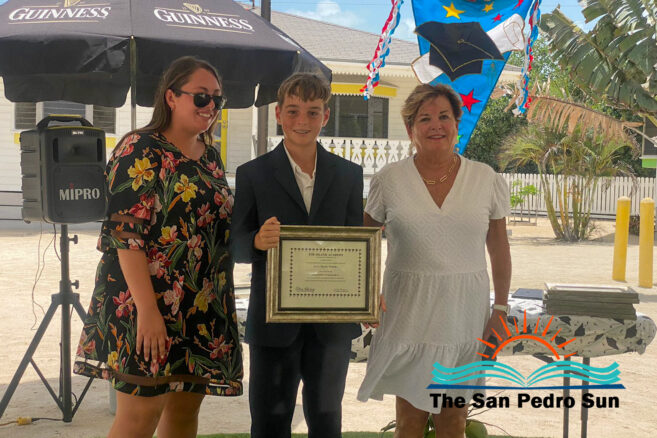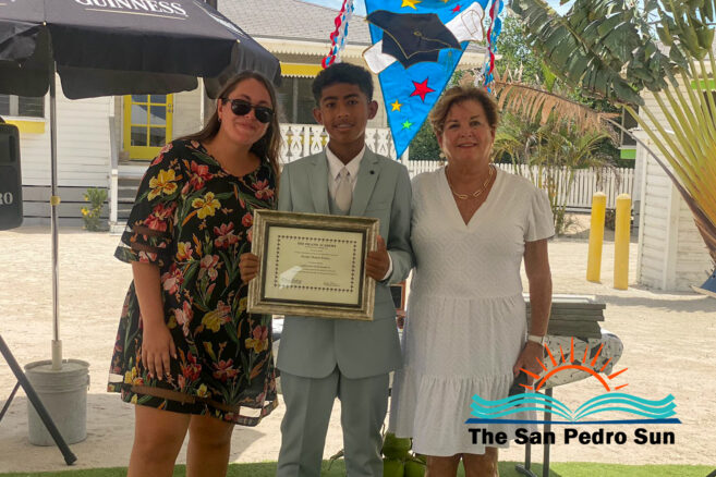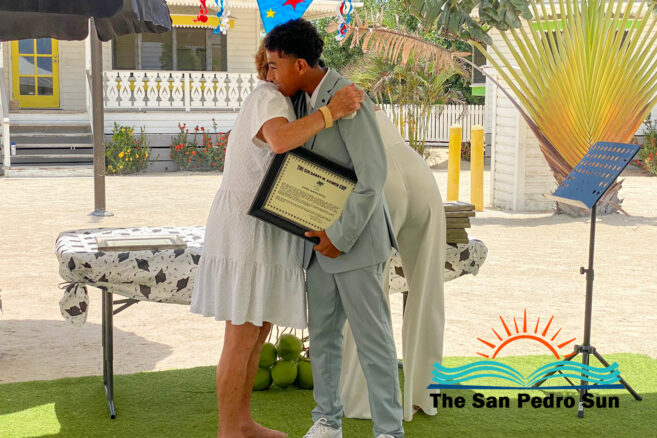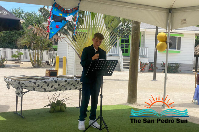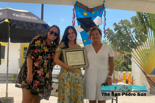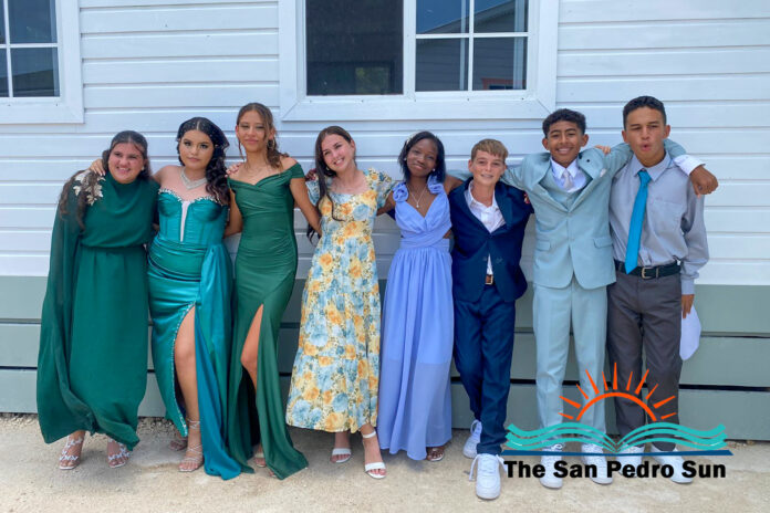 Luca Utrera, Olivia Dominguez, Daniel Estell, Ashley Cardinez, Kayjah Samuels, Hanan Harmouch, Christopher Silva, and Isabella Bowen marched to the tune of Pomp and Circumstance. The ceremony occurred at 10AM at their Mahogany Bay Village campus, south of San Pedro. The event’s program included speeches by teachers who also issued awards to outstanding students of other class levels.