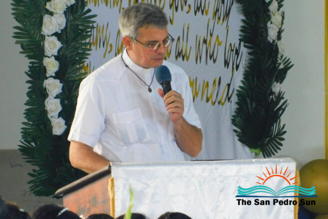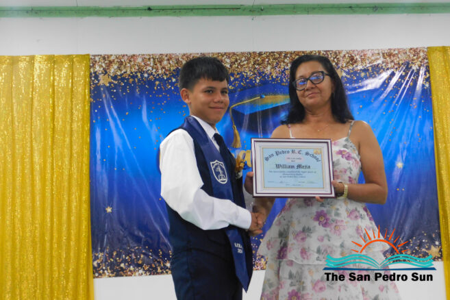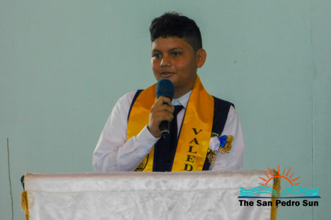 Valedictorian Jeffery Martinez then took to the podium to share his remarks and experiences throughout his primary school years. Martinez commended Teacher Lozano, who coaches the school’s football team. Martinez thanked him, saying that because of his support, the school won this year’s Bishop’s Cup for the second consecutive time. Martinez also congratulated all his fellow graduates and wished them the best. “My fellow graduates, the foundation has been set within us, and now it is our responsibility to make great choices. Let us take advantage of what our parents can give us and accomplish our goals,” he told them. After that, as tradition, Martinez handed over the Valedictorian Torch to Standard Five student Zean Alamilla, who had the highest grades (GPA) at the end of the year.