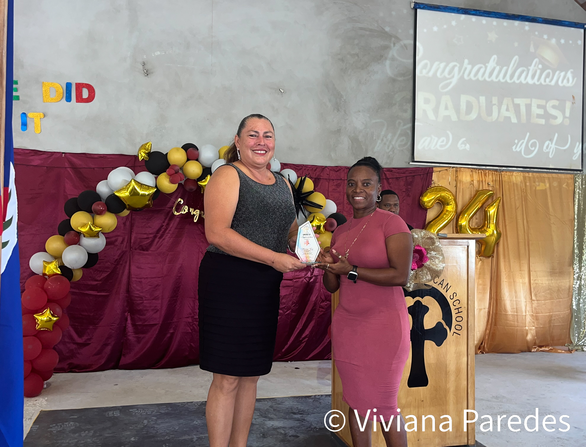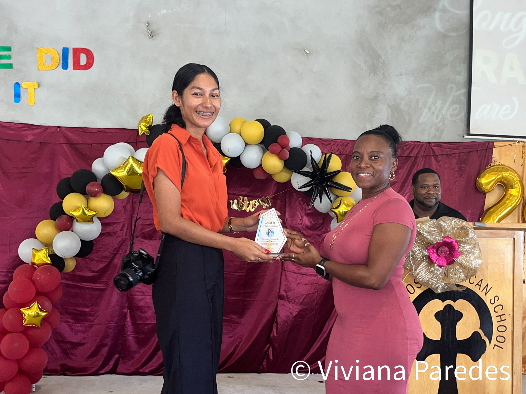 The program began with Ms. Devi Flores as the Mistress of Ceremonies, followed by the graduates singing the National Anthem. Camila Teul delivered a welcoming address, greeting her classmates and families to the faculty graduation day. Principal Olivia Tasher shared words of encouragement for the students, bidding them farewell and emphasizing that anything is possible with determination. She then welcomed the standard five students onto the stage to sing a school song dedicated to the graduates, titled “Today My Life Begins.”