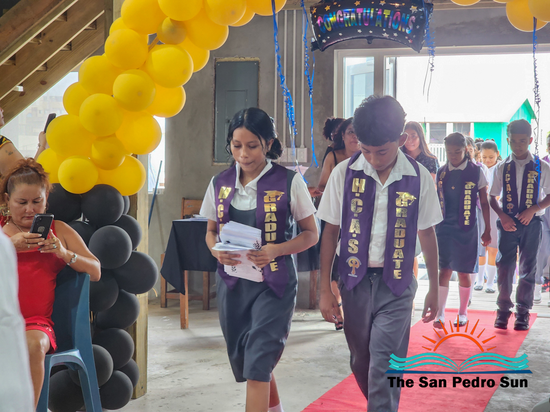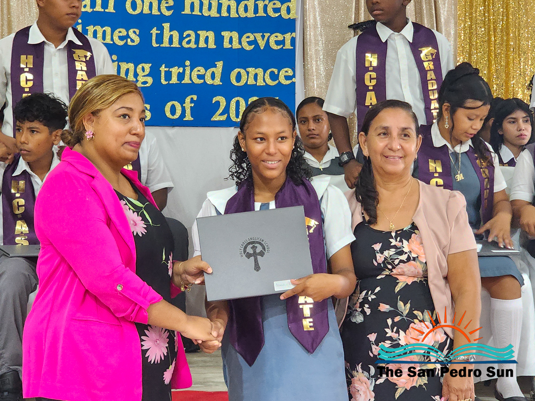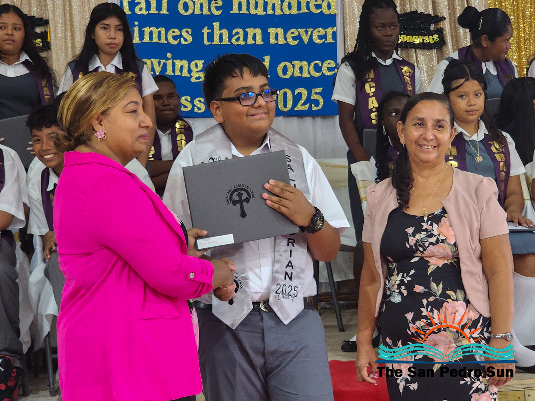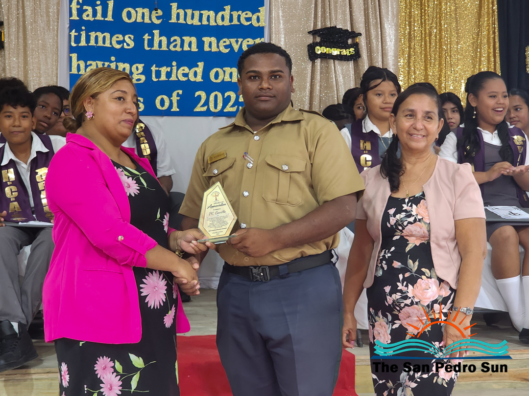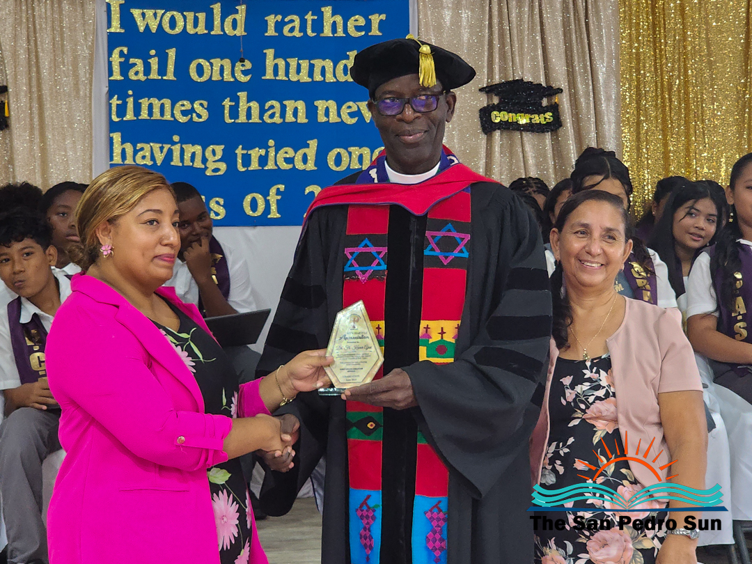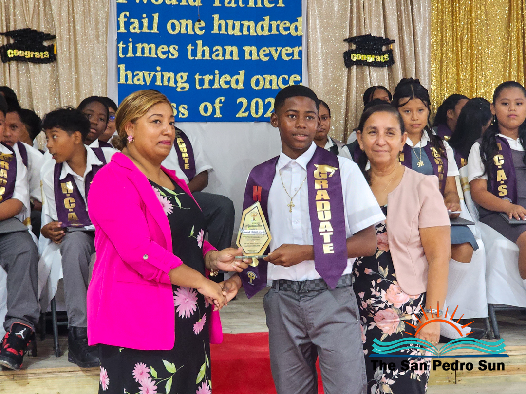 Maricruz Martinez and Principal Torres presented diplomas to each student, followed by the distribution of awards. Honorees included Hon. Minister Andre Perez, PC Gentle, Jorge Cante, Darlene Belgrave, Dr. Fr. Kesner Ajax, Maricruz Martinez, Mazey Lopez, Dernel Martinez, Matachica Resort, Freddy and Trejo, and Roque Martinez.