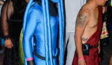 The traditional orange carpet was laid out on Saturday, October 26th, and it was instantly surrounded by eager onlookers who wanted to see what this year would bring. And the creative revelers did not disappoint! Monsters, vampires, witches, and wolves walked the carpet, followed by a gaggle of Disney Princesses (complete with Frog Prince), the cast of Shrek, to red-hot and ab-tastic warriors, naughty nuns, Beyonce, Miley Cyrus (with wrecking ball, of course), to King Kong and captive, Smurfs, Minions, Lady Plavalaguna (of The Fifth Element), zombies, devils, angels, ninjas, elaborate dresses made out of newspapers and crepe paper, and even a costume that required electricity!