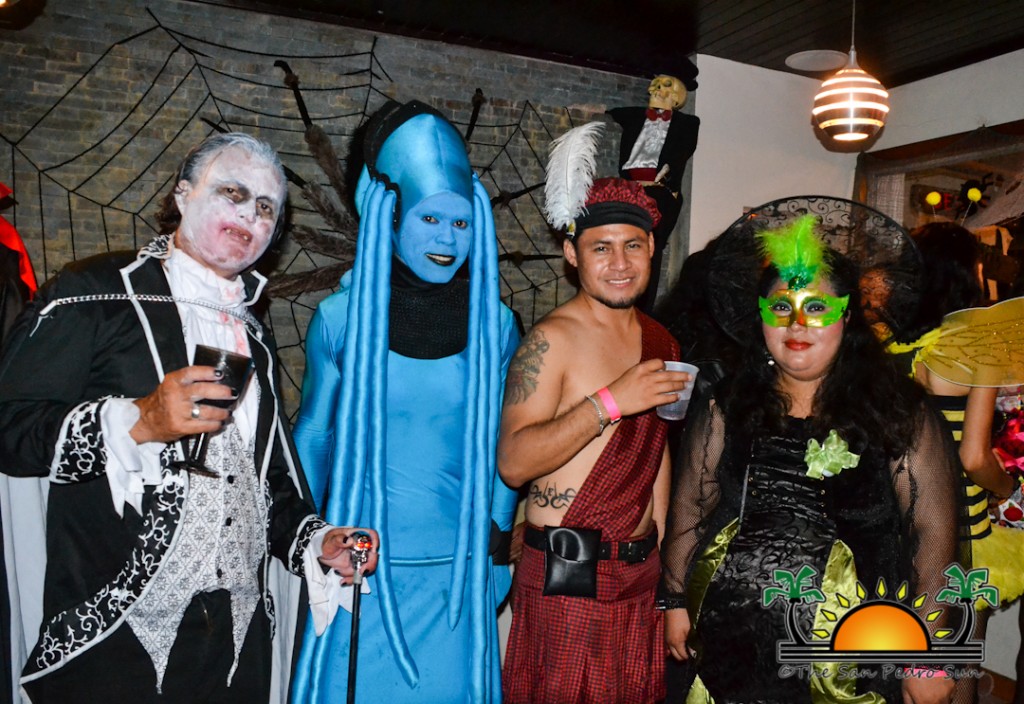 Judges Phil, David and Mary had a hard time deciding on winners, but with the help of Lisa, the final choices were tallied up. Luckily there was a variety of categories to award prizes to, so many favorites were given prizes. Honorable mentions went to Mr. Twister, Miley Cyrus, Slash, Coconut Leo, the Canadian Snowstorm, and the Catch of the Day. Manager’s Favorite went to Bulldozer (Dorian Nuñez), and Lisa’s Favorite went to Electric Man (PK). Crowd favorite went to the adorable pumpkin (Tania Pech’s baby bump), and she also took the prize for cutest. Most elegant went to the beautiful Michelle Nuñez, who handmade her Mystical Mermaid costume. Cutest couples were the School Kids(Alex and Idy) and Despicable Me Minions (Rene Jr. and Chandel). Best makeup went to Michael Hancock, the Decaying Fisherman, while best group went to Dia de Los Muertos. There were two top prizes (of equal value) for Most Creative, and the winners were Leonel Milian as The San Pedro Sun, and Enrique de Leon as the fabulous Lady Plavalaguna!
