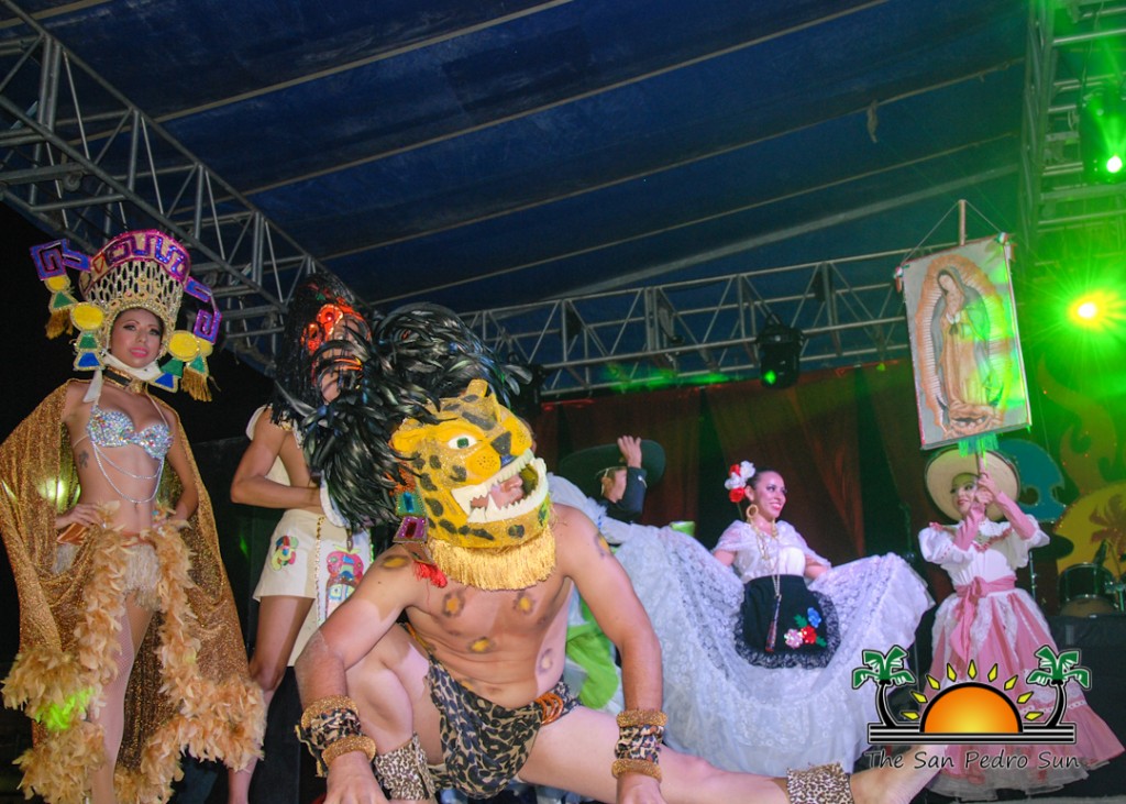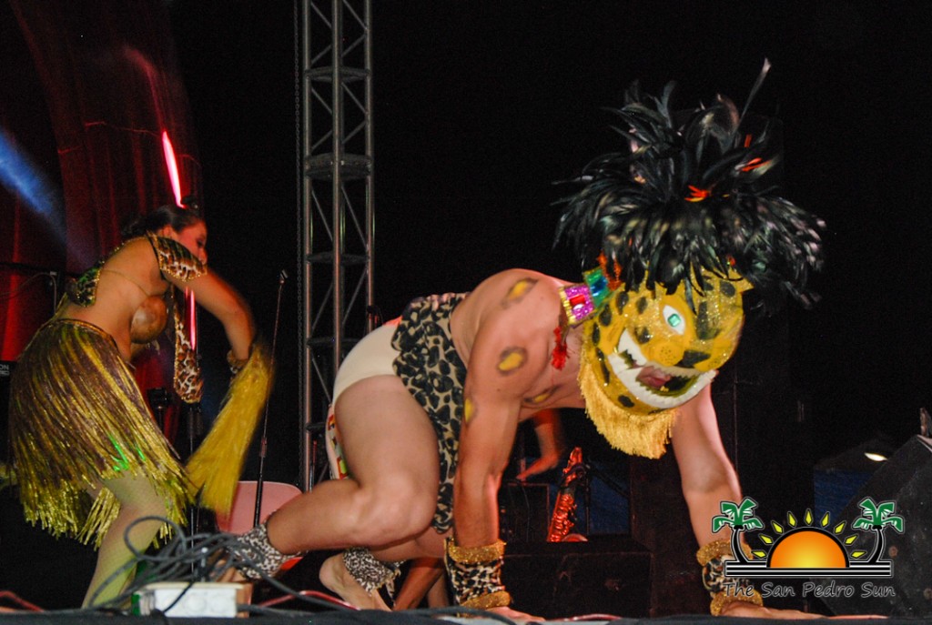 Opening the stage was the lively performance by San Pedro AIDS Commission Carnival Comparsa Group with their popular “Rompe La Piñata” dance sequence. They were followed by Belize’s Soca Queen, the ever-energetic Ernestine Carballo, who was joined by members of the Belize National Dance Company. After properly warming up the stage, the entertainers made way for the eight contestants as they proudly displayed their elaborate and colorful cultural costumes. Feathers, beading, crystals, colors and history were modeled beautifully, a piece of each country depicted with honor and grace.Costa Maya Pageant Performances-11
