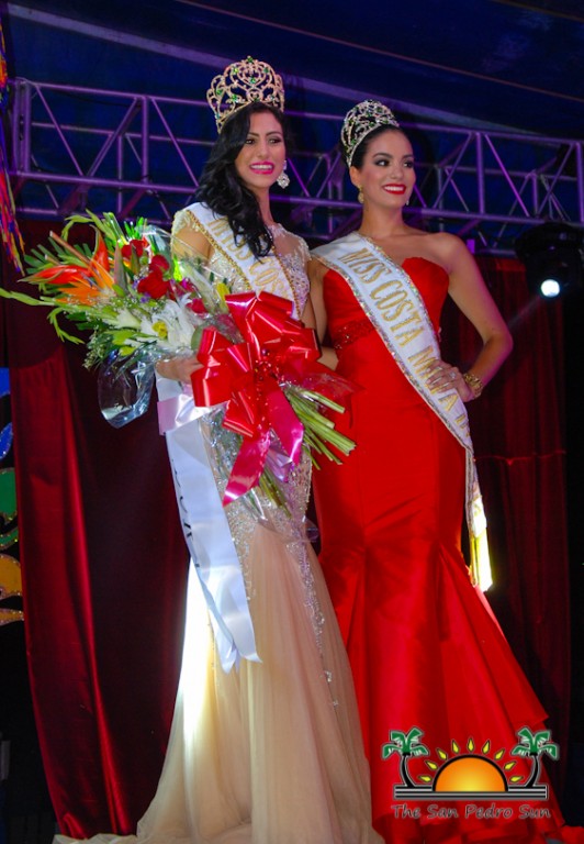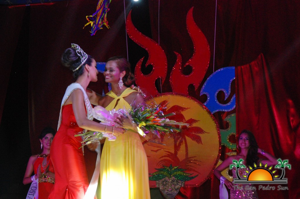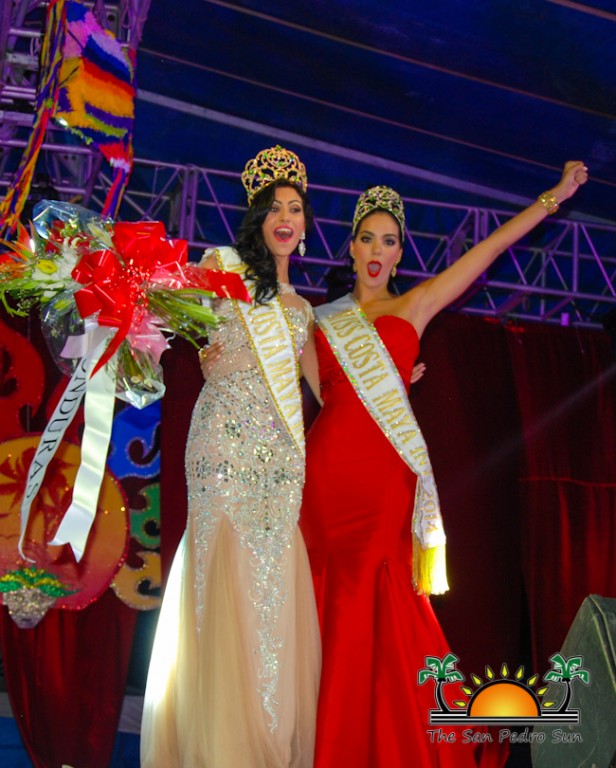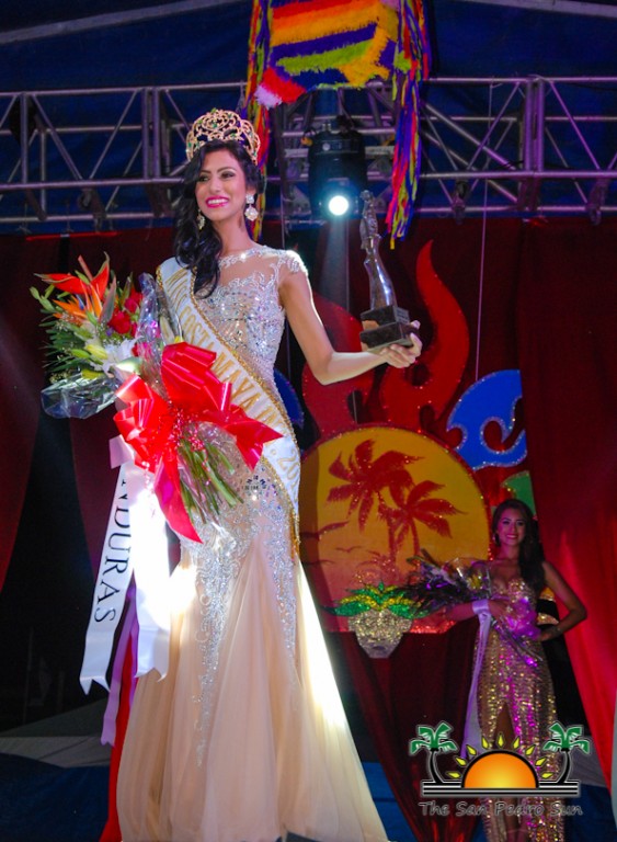 Following a moment of silence, Miss Costa Maya 2014 also gave her farewell tribute before the announcement of the winners could commence. The first prize announced was that of the winner of the costume segment, and taking that title was Miss Honduras, Gabriela Vanessa Salazar Valle. She was gifted with a bouquet and carved trophy. Eiden and Karen then announced the second runner-up, and she is Miss Belize Samalia Vernon. First runner-up was Miss El Salvador Genesis Margarita Fuentes Bolaños. And the new Reina de La Costa Maya is…Miss Honduras Gabriela Vanessa Salazar Valle!