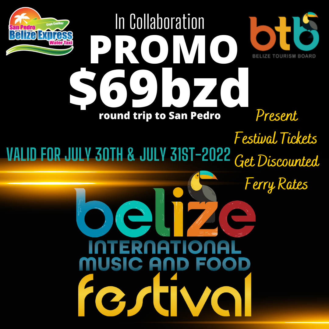 This weekend, Saturday, July 30th, and Sunday, July 31st, San Pedro Town, Ambergris Caye, will host the Belize International Music and Food Festival, the first of its kind. It will take place at the Honourable Louis Sylvestre Complex, Saca Chispas. The festival will include the best of Belizean and international cuisine and an impressive line-up of local and international musical artists. To make it easier for people traveling to the island from the mainland (Belize City), the Belize Tourism Board (BTB) has partnered with San Pedro Belize Express Water Taxi to provide discounted rates on round-trip tickets for those attending the festival.