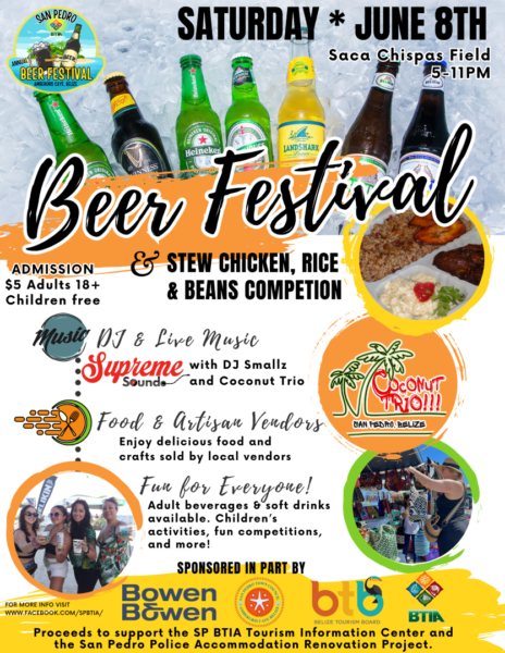 Press Release – San Pedro Town, Ambergris Caye, Belize – May 9, 2024 – The Belize Tourism Industry Association San Pedro Chapter (SP BTIA) is excited to announce the second annual Beer Festival with Stew Chicken Rice and Beans competition. The fundraising event, co-sponsored by Bowen & Bowen, The San Pedro Town Council, and the Belize Tourism Board, will be from 5-11PM on Saturday, June 8th, at the Saca Chispas Field in downtown San Pedro. Proceeds will support the SP BTIA Tourism Information Center on Almond Street, with a percentage of the profits donated to the San Pedro Police Accommodation Renovation Project.