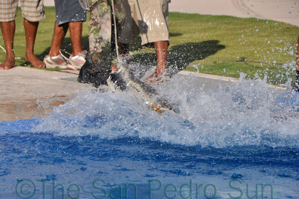The ACES team quickly arrived at the scene, some 3 ½ miles north of San Pedro where indeed a crocodile, known to ACES as #26, was enjoying the deep end of the luxurious infinity pool. #26 is a problematic croc that was first tagged and removed from WASA lagoon south of San Pedro last May where he was being illegally fed as a tourist attraction. Wednesday morning was the first time the 10’4’’ crocodile has surfaced since his relocation in May to an uninhabited area further north of Las Terrazas.