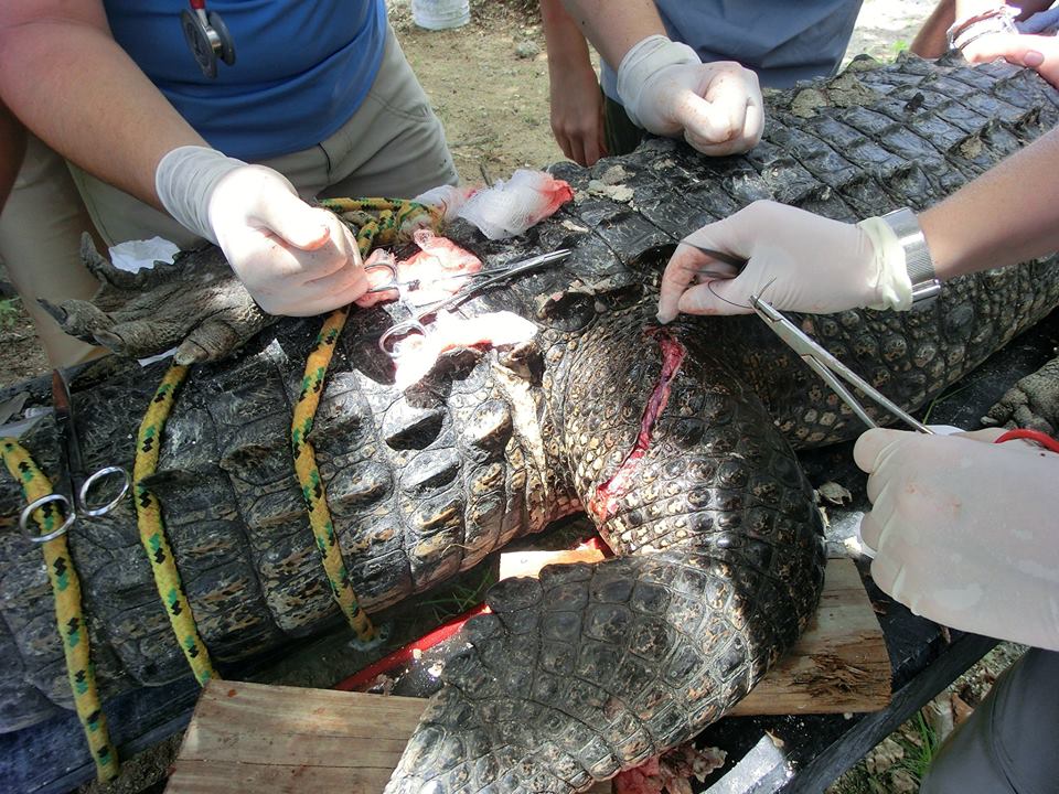 The American Crocodile Education Sanctuary (ACES) along with Doctor Isabelle Paquet-Durand have successfully completed surgery on a rescued American Crocodile. The crocodile was recovered with a large laceration on its right hind leg from the San Juan area on Tuesday, August 27th after ACES received several reports of a problematic crocodile roaming in the streets and yards of nearby houses. ACES quickly acted on the information and removed the croc that had a notable wound on one of its legs.