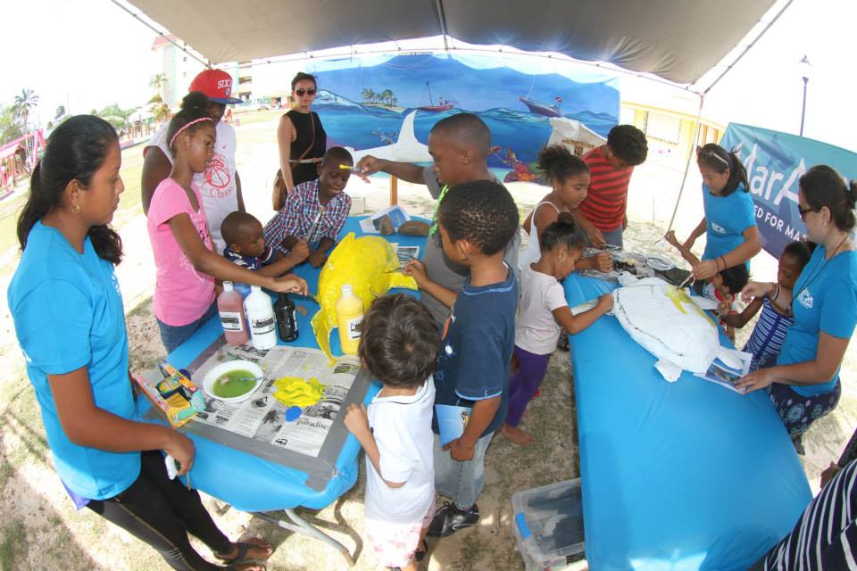 Thanks to The San Pedro Sun’s generous donation of paper, the MarAlliance team was able to develop several large-scale marine animals out of paper mache including a grouper, hawksbill sea turtle, spotted eagle ray, and great hammerhead. Visitors painted the animals and integrated them into a diorama with a sea-themed backdrop painted by the talented local artist Maria Parham. Despite the occasional wind and downpours, the event successfully showcased the work conducted by so many of Belize’s organizations that are devoted to keeping our seas healthy and productive.