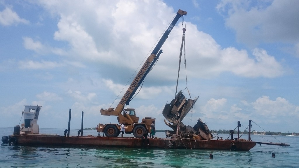 During the initial Environmental Damage Assessment, an attempt was made to bring the sail boat to land, but due to a damaged hull, it was not possible. Instead, the vessel was removed from the crest of the reef and placed in a nearby sea grass bed. As time went by the vessel partially sunk, requiring additional resources to be fully removed from the sea. Island Construction Company provided the necessary equipment and service to remove the sail boat without further damage.