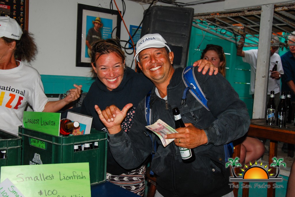 At the end of the tournament, after all the catches had been weighed, the respective winners were announced. The Most Lionfish caught through scuba diving was via Team Sagebrush from San Pedro Town with 78 lionfish caught. Team members were Brad Blanchat, Kyle Thomas, Eddie Ancona, Bill McDonald, Andre Paz, and Justin from Amigos del Mar. They walked away with $500, a case of beer and a bottle of rum. Capturing the prize for the Most Lionfish in free diving, as well as the Smallest Lionfish, was Caye Caulker fisherman Miguel Moreno. He won $600 dollars along with a case of beer and a bottle of rum. The prize for the Largest Lionfish, measuring an impressive 15” went to Stephanie and Henry Lopez from Contour Tours, who took the prize of $100, a case of beer and a bottle of rum. At the end of the award ceremony, the youngest team, Spearheads, was recognized. Even though they did not make it in any of the four main categories, they did well as the youngest group in the competition. They walked away with a $75 certificate courtesy of the Barrier Reef Sports Bar.