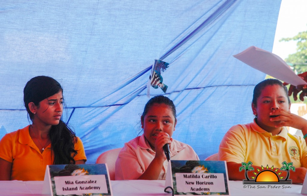 In round one, Yari Flores (ACES), Matilde Carillo (NHSDAS), Mia Gonzalez (Island Academy), Lupita Aldana (CCRC), Edward Polanco (ACES), Astrid Ruiv (NHSDAS), and Ethan Ancona (Island Academy), were asked one basic question about corals, sea turtles, and sea grass question by Mariela Archer, Environmental Educator at Hol Chan Marine Reserve. Judging the contest were Cecilia Guerrero, Nidia Chacon, and Shakera Arnold.