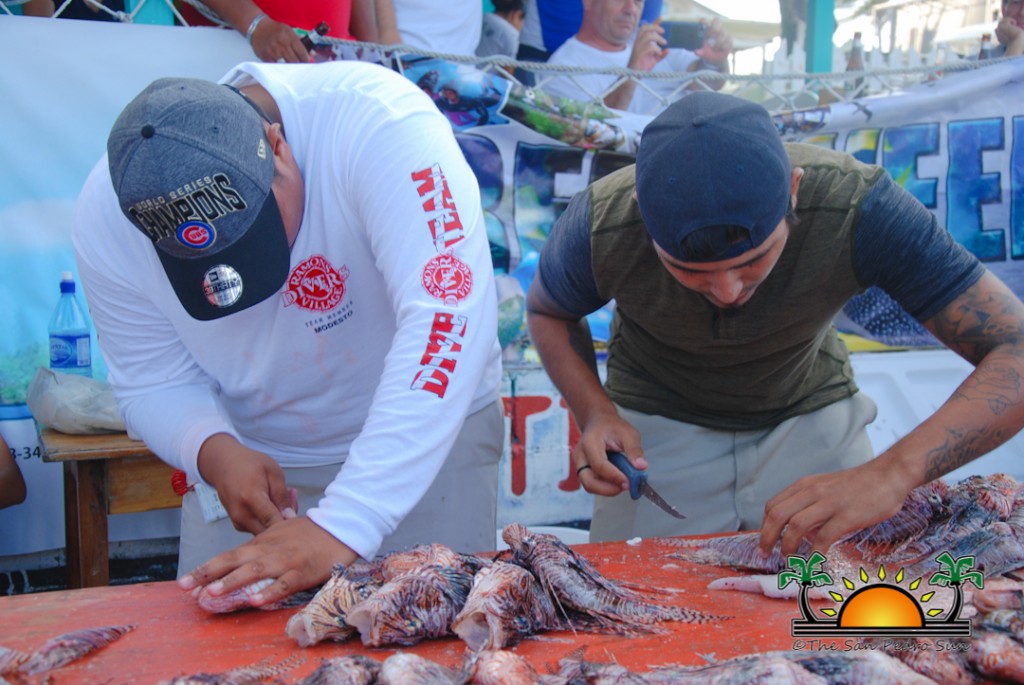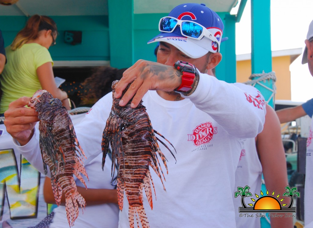 After points were tallied, Amigos Del Mar was declared the winner with 240 lionfish. They won a cash prize of $1,200. In second place was Ramon’s Village, with 168 lionfish, and they won $800 cash. Ramon’s also had the largest catch of the event, with a lionfish measuring at 36.8 centimeters. Belize Diving Adventures (BDA) took third place with 49 lionfish, winning $400. Everette Anderson of BDA also defended his title of “Smallest Lionfish” for the second year in a row, with a lionfish measuring just 3.5 centimeters. Passion Kite Belize- the fun team- after a kitesurfing fishing expedition, and C-Monkey caught 27 lionfish.