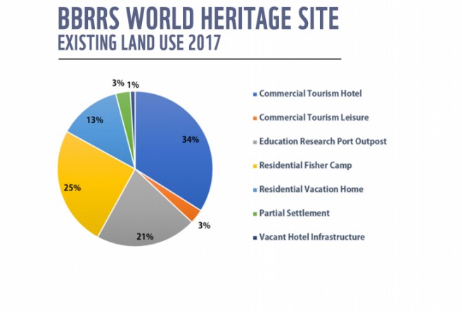 Furthermore, according to the WHS findings, out of 224 development sites identified and analyzed, 71 or 32% are within the BBRRS. Out of these, approximately 24% to 34% are used for commercial tourism-hotel activity; 18% to 25% are for residential-fisher camps; 15% to 21% are for education-research, port-outpost; 9% to 13% are for residential vacation homes; 2% to 3% are partial settlements and commercial-tourist leisure respectively; and 1% is vacant hotel infrastructure.