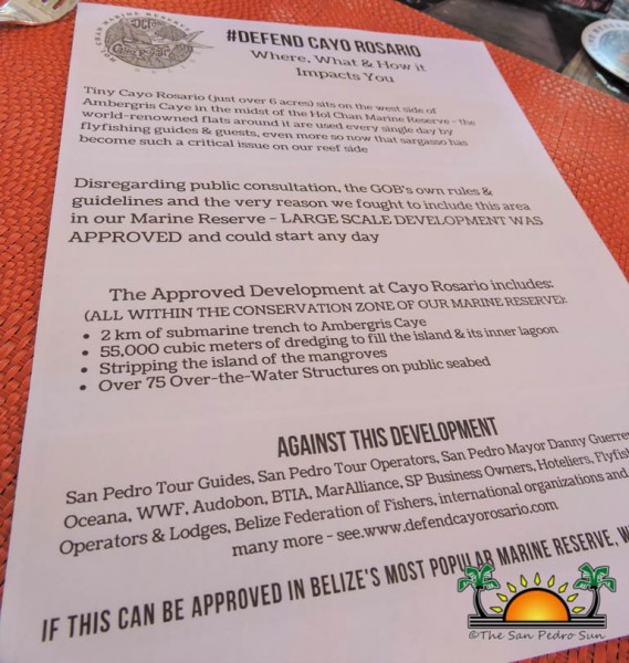 First to speak was ACCSD Board member and President of the San Pedro Tour Guide Association Billy Leslie, who reviewed the history of the Hol Chan Marine Reserve and the part ACCSD played in expanding the reserve in 2015. “We saw that this area on the leeward side of the island, the shoals, the mangrove islands, and bajos were essential to the health of the Hol Chan ecosystem and an important area for the fly-fishing industry. We worked closely with other agencies on the island along with local and national government to make it happen. Our goal was to prevent unsustainable developments like the one approved for Cayo Rosario from ever happening. This sensitive area cannot support the proposed over-the-water structures, dredging, mangrove removal, and sewage system without irreparable damage,” he stated.