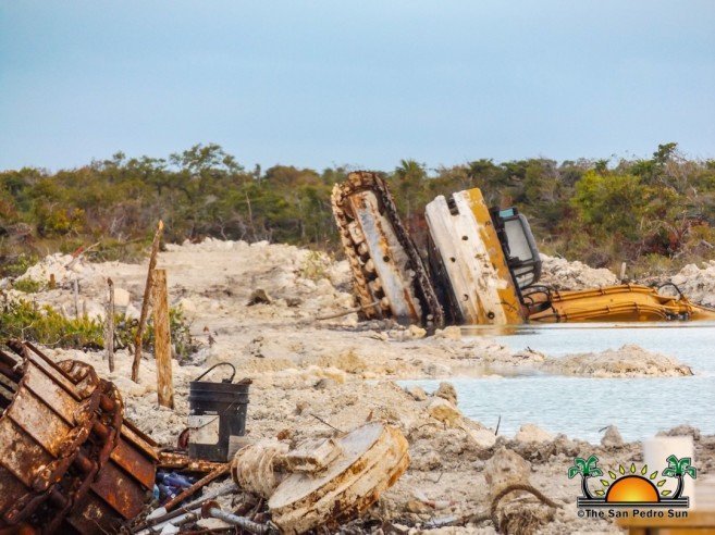 The San Pedro Sun visited the site on Wednesday, March 20th and did not observe any labor force present. There were two excavators and signs of excavation which apparently begun days before. A third excavator was observed in the background, seemingly collapsed in the under-construction channel and half-buried in the mud.
