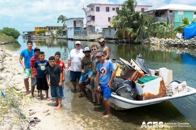 To commemorate Earth Day, American Crocodile Education Sanctuary (ACES) organized a lagoon clean-up activity in San Pedro Town on Monday, April 22nd. The clean-up started around 9AM outside the San Pedrito canal on the mangroves side, opposite from Captain Iguanas. Garbage collected included a lot of glass and plastic bottles, old sofa’s, a rusted fridge, plastic bags, hangers, shoes, lots of household garbage.