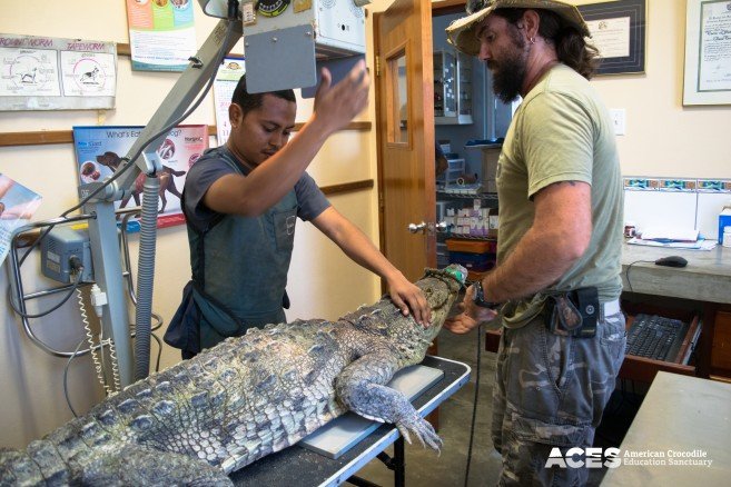 What we saw stopped us all in our tracks. It’s been a long time since I’ve seen a croc looking that bad, but for the two remaining members of the team it was their first time, and it brought tears to their eyes. To say she was underweight is a drastic understatement. This helpless animal was skin and bones. At nine feet long, she could not have weighed more than 100lbs, approximately half of what her weight should be, and she displayed external body conditions, indicating very poor health.