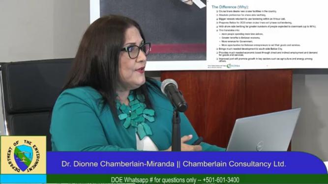 One of the presenters, Dionne Chamberlain-Miranda, tried selling the project’s idea by baiting Belizeans with the promise of jobs. She also explained that the dredging volume would be less than 7.5 million cubic metres and 10 million. She continued that offshore material placement will be done in an environmentally responsible manner, as is done frequently throughout the world.