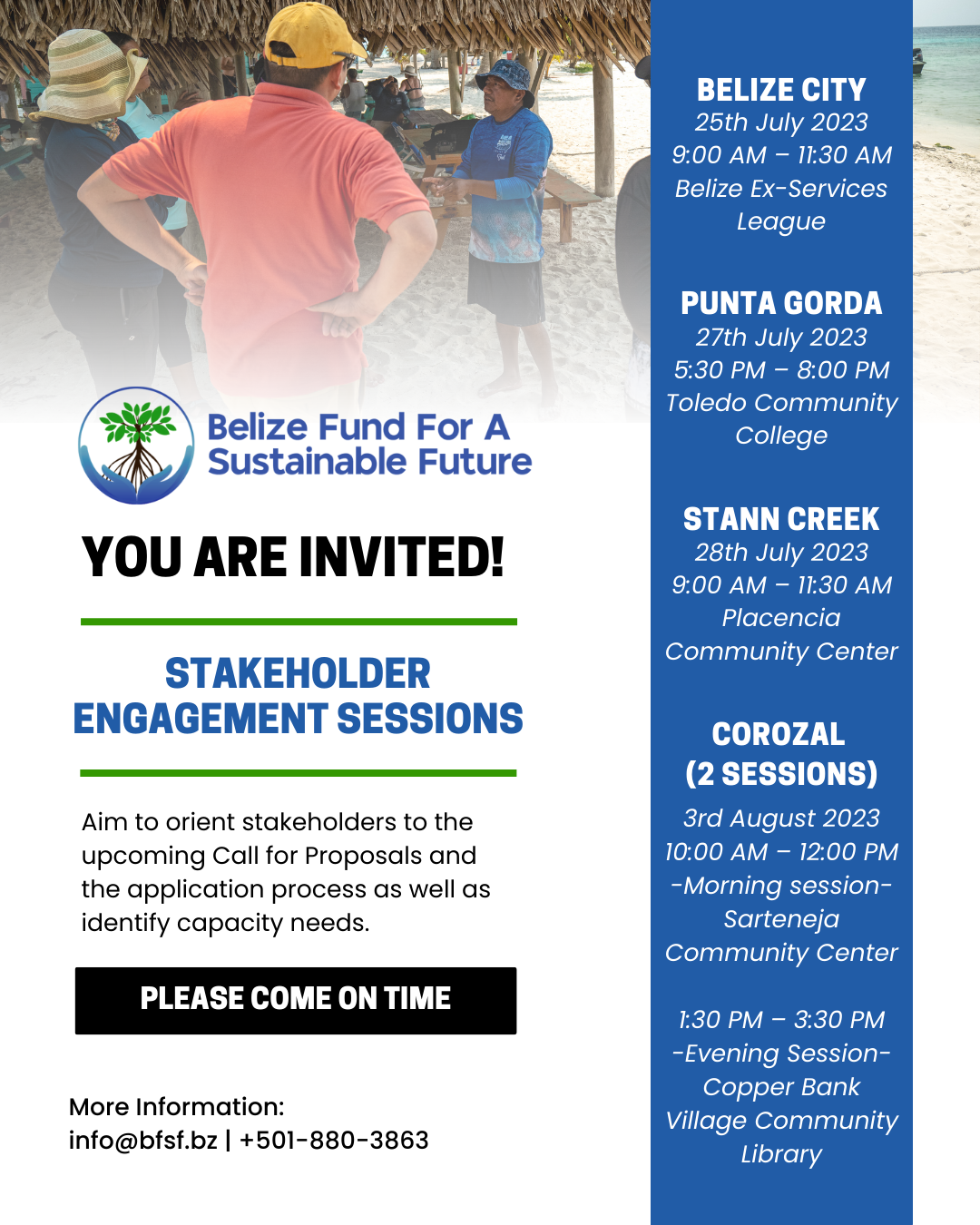 The Belize Fund firmly believes in the importance of supporting capacity development and building long term relationships within coastal and marine communities and stakeholders. We extend a cordial invitation to all those interested to participate in our upcoming stakeholder engagement sessions, which will be held countrywide from July 25th to August 3rd, 2023. These sessions aim to define the capacity needs of our stakeholders and develop solutions that enable access to available funding.
