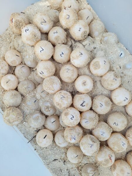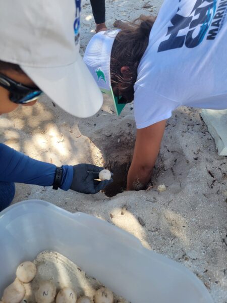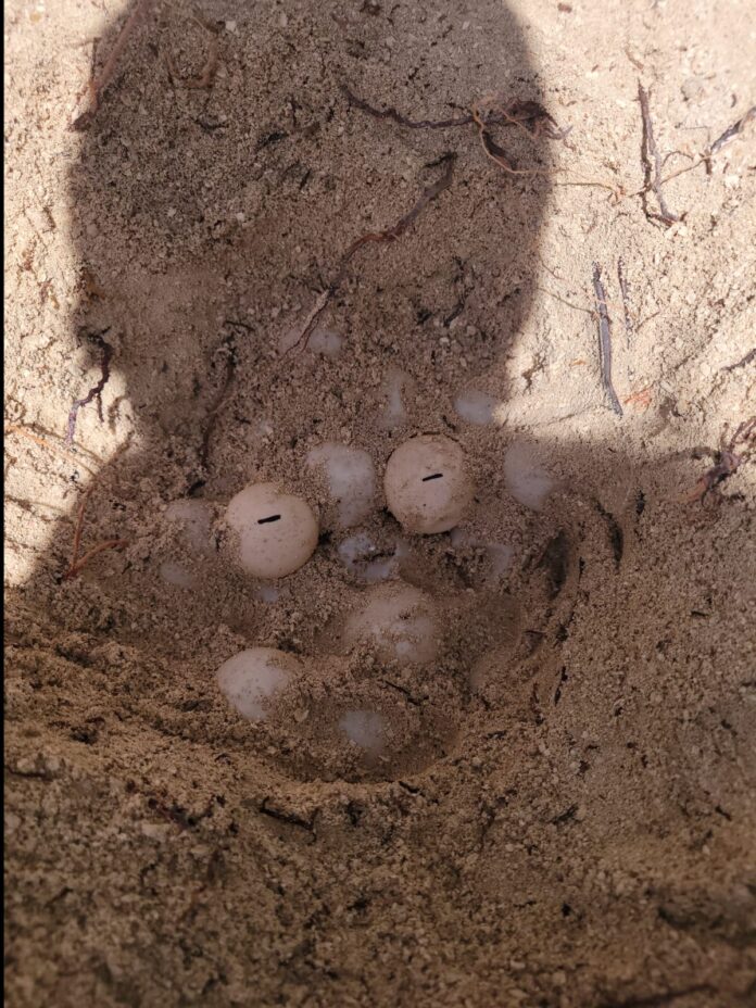 Upon assessment, the HCMRS Biologists determined that the nest required immediate relocation and incubation. This decision was crucial to ensure the chances of the delicate nest’s successful development and emergence. The nest was in a distressed state, inadequately covered with sand, exposing the eggs to potential risks.