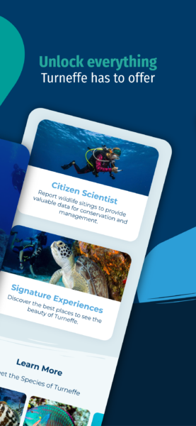 The ‘About’ section is a comprehensive research hub, providing visitors with general information about Turneffe Atoll and its marine species and practical links. The app includes a feature called ‘Citizen Scientist,’ which allows visitors to actively participate in the conservation of Turneffe Atoll by submitting verified data. The ‘Account’ profile page also enables users to track their experiences, including their contributions to citizen science, site visits, and species encounters. The app also incorporates a badge system that rewards users for exploring and contributing to conserving the marine reserve.