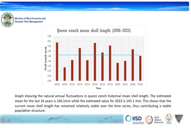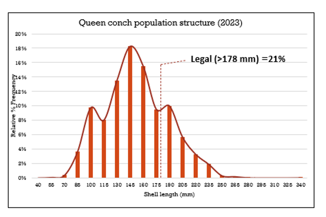 In their report, Esquivel and Gongora pointed out that the national Queen Conch Mean Density was estimated at 403 conch per hectare, an increase of 85.7% compared to the 2022 season, which recorded 217.1 conch per hectare. “Although the shell length was estimated at 145.1mm, representing a decrease of 4.4% when compared to 2022’s 151.8mm, it was a result of the higher abundance of young recruits into the population,” Gongora noted. The national survey results indicated that 21% of the conch population is considered legal size, while 79% are sub-adult. Although the percentage of legal-size conchs may seem low, it corresponds to an estimated weight of 1,455,421 pounds. This represents a 9.2% increase compared to the 2022 biomass of 1,332,647 pounds for maximum sustainable yield. According to the report, the population composition is significantly influenced by the high abundance of sub-adults.