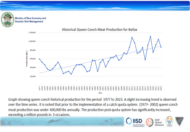 The BFD supplied reports when requested but did not provide the raw data or methodologies. BFD fisheries officers Mauro Gongora and Kenneth Esquivel explained that their sustainable fishing efforts have contributed to the protection of the conch stock. They attribute this success to a catch quota system that is estimated annually based on information derived from rigorous and systematic scientific stock assessments.