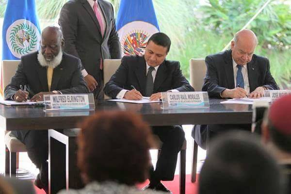 Belize and Guatemala have officially signed the amendments to the Special Agreement in reference to the referendum on whether the Guatemala-Belize territorial dispute should be settled at the International Court of Justice (ICJ). The signing took place on Monday, May 26th at a special ceremony in Guatemala City, Guatemala. The amendment will allow Belize and Guatemala to hold the referendum at their convenience without the need to be simultaneous. The document was signed by Belize’s Minister of Foreign Affairs the Honorable Wilfred Elrington and Guatemalan Foreign Minister Carlos Raul Morales, along with the outgoing Secretary General of the Organization of American State (OAS) José Miguel Insulza.